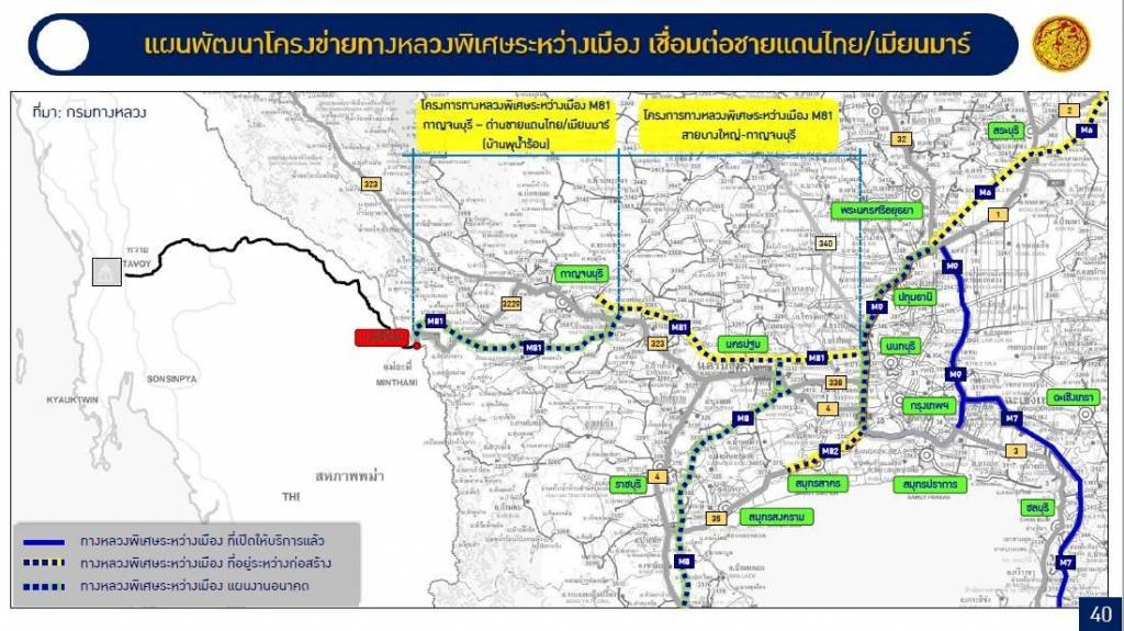 - โครงการทางหลวงพิเศษระหว่างเมือง M81 กาญจนบุรี - ชายแดนไทย/เมียนมาร์ (บ้านพุน้ำร้อน) เป็นทางหลวงพิเศษระหว่างเมืองขนาด 4 ช่องจราจร มีจุดเริ่มต้นจากทางหลวงพิเศษระหว่างเมือง สายบางใหญ่ - กาญจนบุรี สิ้นสุดที่ด่านพรมแดนบ้านพุน้ำร้อน ระยะทาง 82 กิโลเมตร ความก้าวหน้าการดำเนินงานได้ศึกษาความเหมาะสมของโครงการ (FS) และออกแบบรายละเอียดแล้วเสร็จ สำหรับรูปแบบการลงทุนและแผนดำเนินโครงการอยู่ระหว่างรอความชัดเจนของการพัฒนาท่าเรือน้ำลึกทวาย