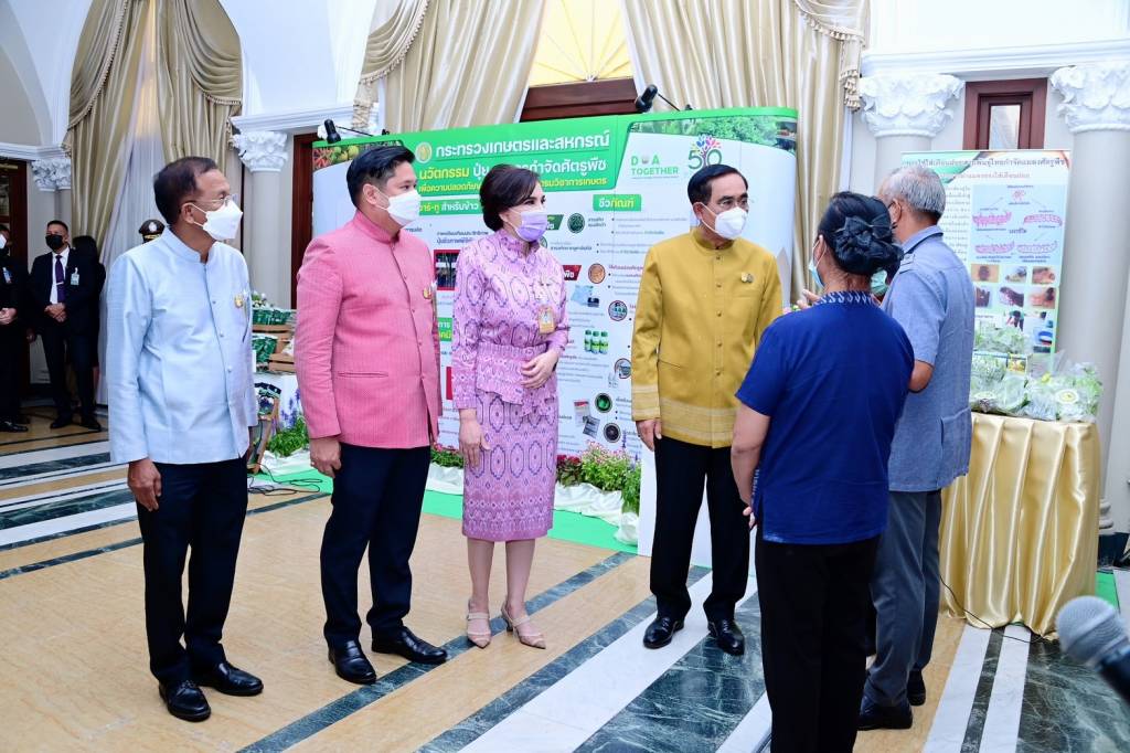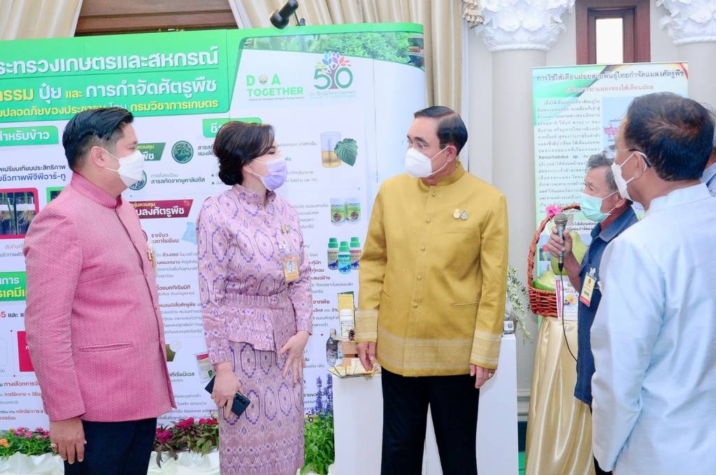 น.ส.มนัญญา ไทยเศรษฐ์ รัฐมนตรีช่วยว่าการกระทรวงเกษตรและสหกรณ์ นำพลเอกประยุทธ์ จันทร์โอชา นายกรัฐมนตรี เยี่ยมชมนิทรรศการ "นวัตกรรมปุ๋ยและการกำจัดศัตรูพืช เพื่อความปลอดภัยของประชาชน" จัดโดย กรมวิชาการเกษตร กระทรวงเกษตรและสหกรณ์