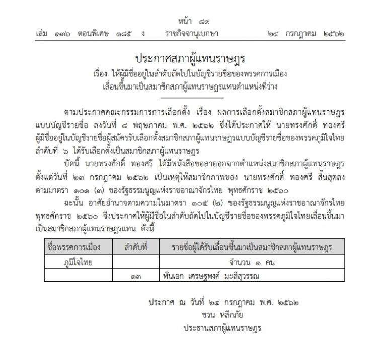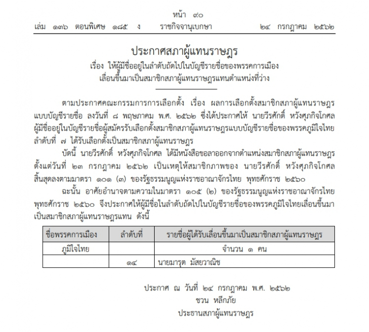ราชกิจจาฯเผยแพร่ประกาศสภาผู้แทนฯ'เศรษฐพงค์-มารุต'เลื่อนลำดับเป็นส.ส.บัญชีรายชื่อ