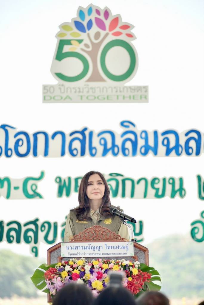 นางสาวมนัญญา ไทยเศรษฐ์ รัฐมนตรีช่วยว่าการกระทรวงเกษตรและสหกรณ์ กล่าวในโอกาสเป็นประธานในพิธีเปิดงานวันถ่ายทอดเทคโนโลยีการผลิตพืช ในโอกาสเฉลิมฉลองครบรอบ 50 ปี กรมวิชาการเกษตร จัดขึ้นระหว่างวันที่ 3 - 4 พฤศจิกายน 2565 ณ ศูนย์วิจัยพืชไร่นครสวรรค์ ต.สุขสำราญ อ.ตากฟ้า จ.นครสวรรค์ โดยมีนายระพีภัทร์ จันทรศรีวงศ์ อธิบดีกรมวิชาการเกษตร และคณะผู้บริหารกรมวิชาการเกษตร เข้าร่วมว่า การจัดงานถ่ายทอดเทคโนโลยีในครั้งนี้เป็นการบูรณาการความร่วมมือกันระหว่างสำนักวิจัยและพัฒนาการเกษตรเขตที่ 5 จ.ชัยนาท สำนักวิจัยและพัฒนาการเกษตรเขตที่ 2 จ.พิษณุโลก และสถาบันวิจัยพืชไร่และพืชทดแทนพลังงาน เพื่อขยายผลงานวิจัยและเทคโนโลยีของกรมวิชาการเกษตรให้เกษตรกรนำไปปรับใช้ให้เหมาะสมกับสภาพพื้นที่ สามารถผลิตพืชได้อย่างถูกต้องและลดต้นทุนการผลิต รวมทั้งยังเป็นการสร้างและพัฒนาเครือข่ายระหว่างเกษตรกร ผู้บริโภค ผู้ประกอบการทั้งระดับชุมชนและอุตสาหกรรม ทำให้เกิดระบบการผลิตแบบครบวงจรและยั่งยืน สามารถกระตุ้นเศรษฐกิจไทยจากการพัฒนาภาคการเกษตรไทยด้วยผลงานวิจัยและนวัตกรรม