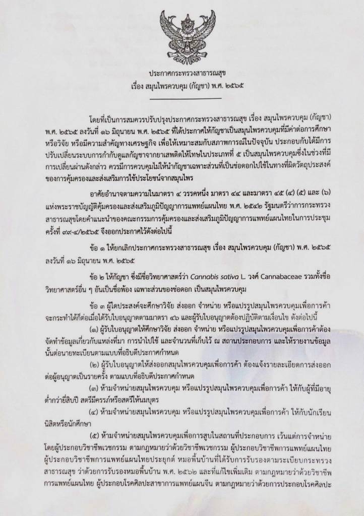 วันที่ 12 พ.ย.2565 ผู้สื่อข่าวรายงานว่า วานนี้(11 พ.ย.) นายอนุทิน ชาญวีรกูล รองนายกรัฐมนตรีและ รัฐมนตรีว่าการกระทรวงสาธารณสุข ได้ลงนามในประกาศกระทรวงสาธารณสุข เรื่อง สมุนไพรควบคุม (กัญชา) พ.ศ. 2565 เนื้อหาระบุว่า