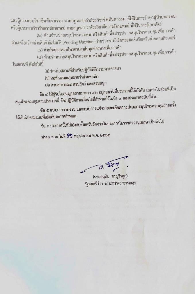 เข้มดูแลกัญชา ! “อนุทิน” ลงนามประกาศ สธ. ให้ “ช่อดอก” เป็นสมุนไพรควบคุม ห้ามจำหน่ายให้เด็ก สตรีมีครรภ์ นักเรียน นักศึกษา ห้ามโฆษณาเพื่อการค้า ห้ามจำหน่ายเพื่อการสูบในสถานประกอบการ ห้ามจำหน่ายผ่านตู้อัตโนมัติ