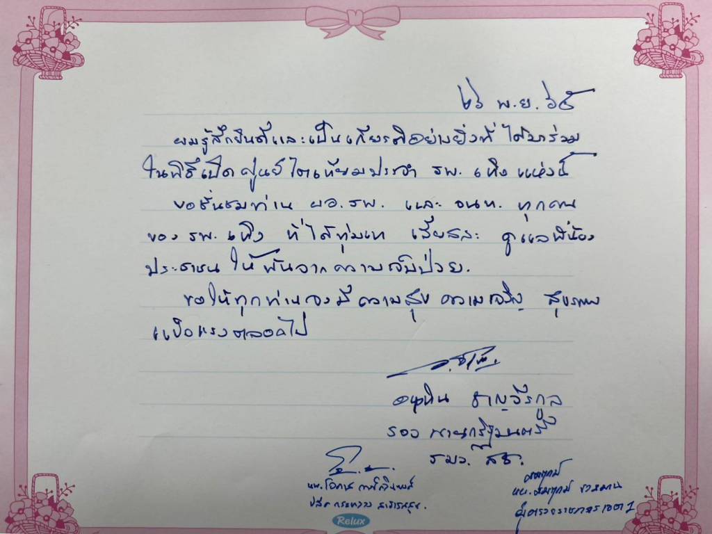 “ต้องขอบคุณ ส.ส.รังสรรค์ ไปจนถึงทีมแพทย์ ทีมเจ้าหน้าที่ ที่ให้ข้อมูล ซึ่งเป็นประโยชน์ ท่านผลักดัน มาตลอด ซึ่งเราก็เข้าใจความเป็นห่วงพี่น้องประชาชนของท่าน และร่วมมือกัน ทำให้สำเร็จ ตอนนี้ มีเครื่องฟอกไต 16 เครื่อง ซึ่งช่วยเหลือประชาชนจำนวนมาก”