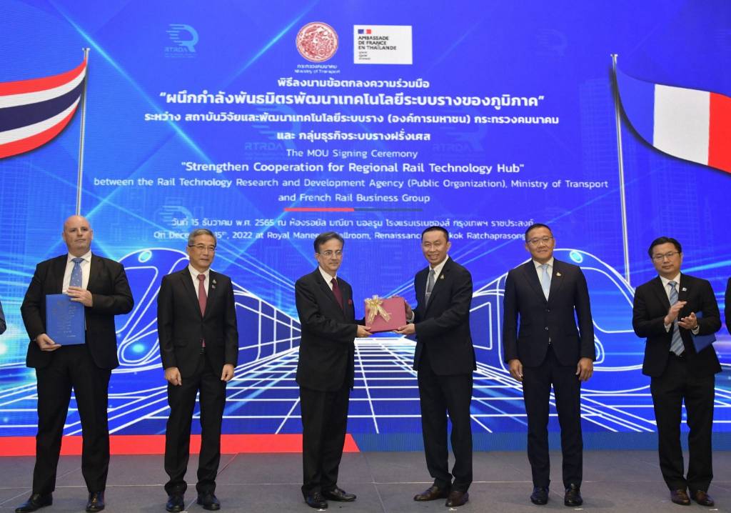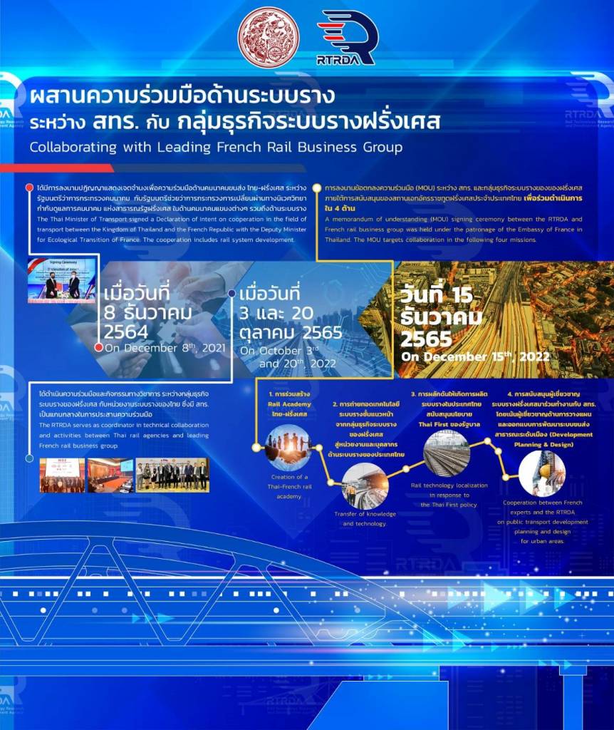 สำหรับการลงนามบันทึกข้อตกลงความร่วมมือในวันนี้ เป็นการต่อยอดความร่วมมือการผนึกกำลังพัฒนาศักยภาพบุคลากร เทคโนโลยี และนวัตกรรม ระหว่างสถาบันวิจัยและพัฒนาเทคโนโลยีระบบราง (องค์การมหาชน) และกลุ่มอุตสาหกรรมระบบรางจากประเทศฝรั่งเศส 5 บริษัท ประกอบด้วย