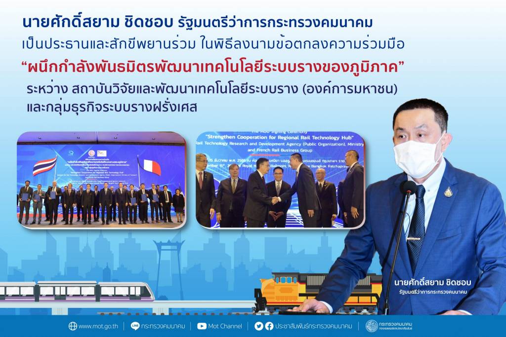 นายศักดิ์สยาม ชิดชอบ รัฐมนตรีว่าการกระทรวงคมนาคม กล่าวว่า กระทรวงคมนาคม ได้ดำเนินการตามนโยบายของรัฐบาลภายใต้การนำของ พลเอกประยุทธ์ จันทร์โอชา นายกรัฐมนตรี ที่กำหนดยุทธศาสตร์ชาติ ระยะ 20 ปี ให้เป็นกรอบทิศทางการขับเคลื่อนพัฒนาประเทศให้เดินหน้าไปสู่ความมั่นคง มั่งคั่ง และยั่งยืน ควบคู่กับแผนยุทธศาสตร์ กระทรวงคมนาคม โดยบูรณาการแผนงาน โครงการต่าง ๆ เพื่อยกระดับคุณภาพบริการเทียบเท่ามาตรฐานสากล เชื่อมโยงการเดินทางขนส่งสินค้าจากตะวันตกถึงตะวันออก และเหนือสู่ใต้ รองรับการเชื่อมต่อไปยังประเทศเพื่อนบ้าน ในภูมิภาคอาเซียน พร้อมทั้งปรับปรุงกฎหมาย กฎ ระเบียบที่เกี่ยวข้อง รวมถึงผลิตและพัฒนาบุคลากร ตลอดจนส่งเสริมการวิจัย การพัฒนาเทคโนโลยี และนวัตกรรม ครอบคลุมทุกมิติ จึงได้จัดตั้ง สถาบันวิจัยและพัฒนาเทคโนโลยีระบบราง (องค์การมหาชน) ขึ้น เพื่อกำหนดยุทธศาสตร์ด้านวิจัยและพัฒนาเทคโนโลยี นวัตกรรม พร้อมรับรองมาตรฐาน ระบบการทดสอบ และประเมินคุณภาพระบบราง รวมถึงเป็นศูนย์กลางด้านการถ่ายทอดเทคโนโลยีระบบรางของภูมิภาค ตลอดจนพัฒนาบุคลากร และจัดทำฐานข้อมูลที่เกี่ยวข้องกับเทคโนโลยีระบบราง โดยเริ่มต้นจากการดำเนินงานภายใต้กรอบความร่วมมือปฏิญญาไทย - ฝรั่งเศส ว่าด้วยความร่วมมือในสาขาคมนาคมขนส่ง โดยได้ลงนามปฏิญญาแสดงเจตจำนงว่าด้วยความร่วมมือในสาขาคมนาคมขนส่งระหว่างประเทศฝรั่งเศสกับประเทศไทย เมื่อวันที่ 8 ธันวาคม 2564