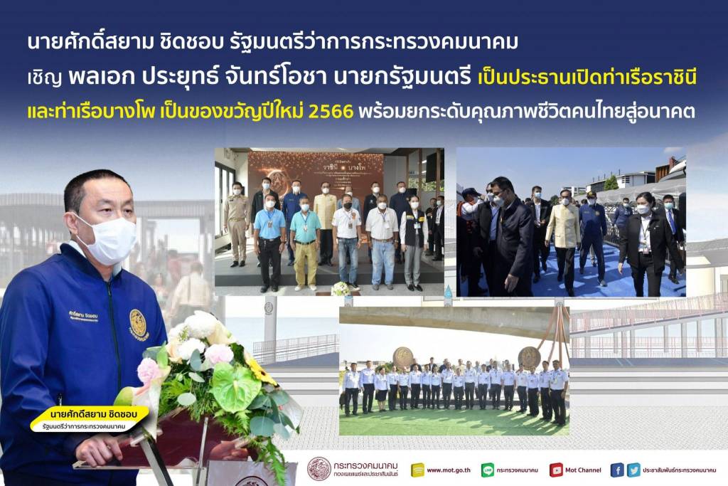 พลเอก ประยุทธ์ จันทร์โอชา นายกรัฐมนตรี เป็นประธานในพิธีเปิดท่าเรือราชินีและท่าเรือบางโพ เพื่อเป็นของขวัญปีใหม่ 2566 พร้อมยกระดับคุณภาพชีวิตคนไทยสู่อนาคต โดยมี พลเอก อนุพงษ์ เผ่าจินดา รัฐมนตรีว่าการกระทรวงมหาดไทย นายธนกร วังบุญคงชนะ รัฐมนตรีประจำสำนักนายกรัฐมนตรี นายศักดิ์สยาม ชิดชอบ รัฐมนตรีว่าการกระทรวงคมนาคม นายอธิรัฐ รัตนเศรษฐ รัฐมนตรีช่วยว่าการกระทรวงคมนาคม นายชยธรรม์ พรหมศร ปลัดกระทรวงคมนาคม นายสรพงศ์ ไพฑูรย์พงษ์ รองปลัดกระทรวงคมนาคม รักษาราชการแทนอธิบดีกรมเจ้าท่า นายจิรุตม์ วิศาลจิตร อธิบดีกรมการขนส่งทางบก รักษาราชการแทนรองปลัดกระทรวงคมนาคม ผู้บริหารกระทรวงคมนาคม หัวหน้าส่วนราชการ และภาคเอกชน เข้าร่วมพิธี ในวันศุกร์ที่ 23 ธันวาคม 2565 ณ ท่าเรือราชินี แขวงพระบรมมหาราชวัง เขตพระนคร และท่าเรือบางโพ แขวงบางซื่อ เขตบางซื่อ กรุงเทพมหานคร