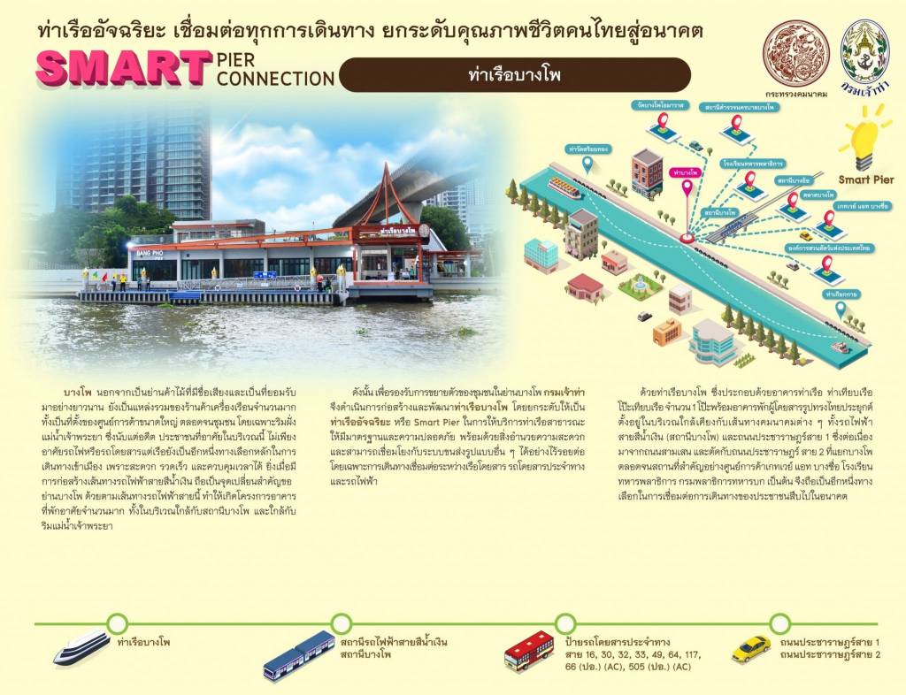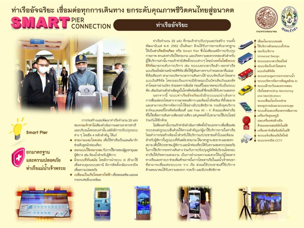 นายศักดิ์สยาม ชิดชอบ รัฐมนตรีว่าการกระทรวงคมนาคม กล่าวว่า รัฐบาลภายใต้การนำของ พลเอก ประยุทธ์ จันทร์โอชา นายกรัฐมนตรี ได้กำหนดยุทธศาสตร์ชาติ ระยะ 20 ปี (พ.ศ. 2561 - 2580) ซึ่งกระทรวงคมนาคมได้มุ่งเน้นและให้ความสำคัญกับการพัฒนาโครงข่ายคมนาคมทั้งทางบก ทางราง ทางน้ำ และทางอากาศให้มีความเชื่อมโยงที่ไร้รอยต่อ สะดวก ปลอดภัย เป็นมิตรต่อสิ่งแวดล้อม เพื่อที่จะช่วยยกระดับขีดความสามารถในการแข่งขันของประเทศไทย โดย จท. หน่วยงานที่มีภารกิจในการพัฒนาการขนส่งทางน้ำ ได้กำหนดแผนพัฒนายกระดับท่าเรือโดยสาร (Smart Pier) ในแม่น้ำเจ้าพระยา ตั้งแต่ปี 2562 - 2568 ที่จะพัฒนาท่าเรือ จำนวน 29 แห่ง ในเขตกรุงเทพมหานครและปริมณฑล ดังนี้