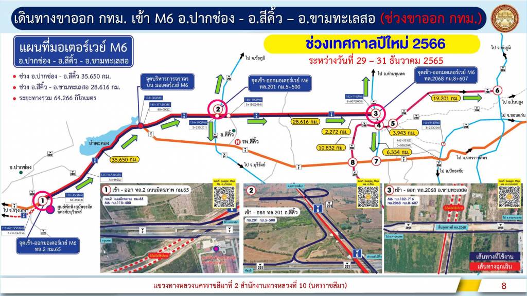 รัฐมนตรีว่าการกระทรวงคมนาคม กล่าวเพิ่มเติมว่า การเตรียมความพร้อมเพื่อรองรับการเดินทางของประชาชนในช่วงเทศกาลปีใหม่ 2566 หน่วยงานในสังกัดกระทรวงฯ และหน่วยงานในพื้นที่ มีการบูรณาการการทำงานร่วมกัน ทำให้สามารถบริหารจัดการการเดินทางเพื่ออำนวยความสะดวกประชาชนได้เป็นอย่างดี โดยมีวัตถุประสงค์เพื่อให้ประชาชนได้รับความสะดวกปลอดภัยในการเดินทาง ป้องกัน ลดจำนวนอุบัติเหตุ ลดความสูญเสีย โดยเป็นการสร้างการรับรู้ประชาสัมพันธ์ให้แก่ประชาชน ลดพฤติกรรมเสี่ยงในการขับขี่และเสริมสร้างความร่วมมืออันดี และจากการตรวจสภาพการจราจรทางอากาศพบว่า สถานการณ์เดินทางของประชาชนในภาพรวมยังคล่องตัว แต่มีการชะลอตัวบริเวณหน้าด่านบริการ ทางหลวงพิเศษระหว่างเมืองหมายเลข 9 (M9) ด่านทับช้าง 1 ด่านทับช้าง 2 รวมถึงบริเวณทางเชื่อมทางโค้ง เนิน และบริเวณหน้าสถานีบริการน้ำมัน สำหรับทางหลวงพิเศษระหว่างเมืองหมายเลข 6 (M6) ที่จะเปิดให้ใช้งานชั่วคราวฟรี ระหว่างวันที่ 29 ธันวาคม 2565 - 4 มกราคม 2566 การบริหารจัดการจราจรเป็นไปด้วยความเรียบร้อยพร้อมรองรับการเดินทางมุ่งสู่พื้นที่ 20 จังหวัดภาคอีสาน