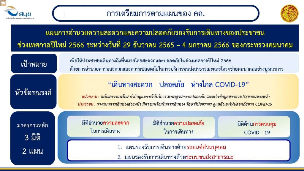 เทศกาลปีใหม่มีวันหยุดราชการ ติดต่อหลายวัน เริ่มตั้งแต่วันที่ 30 - 31 ธันวาคม 2565 และต่อเนื่องไปถึงวันที่ 1 - 2 มกราคม 2566 เป็นเวลาทั้งสิ้น 4 วัน รัฐบาลโดยกรมป้องกันและบรรเทาสาธารณภัย กระทรวงมหาดไทย ได้กำหนดแนวทางในการดำเนินการและตัวชี้วัดสำหรับหน่วยงานต่าง ๆ ในการเตรียมความพร้อมช่วงวันหยุดเทศกาลปีใหม่ที่จะมาถึงนี้ ในส่วนของกระทรวงคมนาคมได้รับผิดชอบตัวชี้วัด ได้แก่ จำนวนครั้งการเกิดอุบัติเหตุ จำนวนผู้เสียชีวิต และจำนวนผู้บาดเจ็บที่เกิดบนถนน รวมถึงการบริการรถขนส่งสาธารณะต้องลดลงไม่น้อยกว่าร้อยละ 5 จากการคาดการณ์ปริมาณการเดินทางของกระทรวงคมนาคม จะมีประชาชนจำนวนมากเดินทางเพื่อกลับภูมิลำเนา ท่องเที่ยว หรือทำบุญด้วยรถยนต์ส่วนบุคคล และใช้บริการขนส่งสาธารณะ กระทรวงคมนาคมจึงได้จัดทำแผนการอำนวยความสะดวกและความปลอดภัยรองรับการเดินทางของประชาชน ช่วงเทศกาลปีใหม่ พ.ศ. 2566 เริ่มระหว่างวันที่ 29 ธันวาคม 2565 - วันที่ 4 มกราคม 2566 พร้อมกำชับหน่วยงานในสังกัดกระทรวงคมนาคมบูรณาการร่วมกันขับเคลื่อนแผนให้เกิดผลสัมฤทธิ์ “เพื่อให้ประชาชนเดินทางสะดวก ปลอดภัย ห่างไกล COVID-19” ในมิติต่าง ๆ ดังนี้
