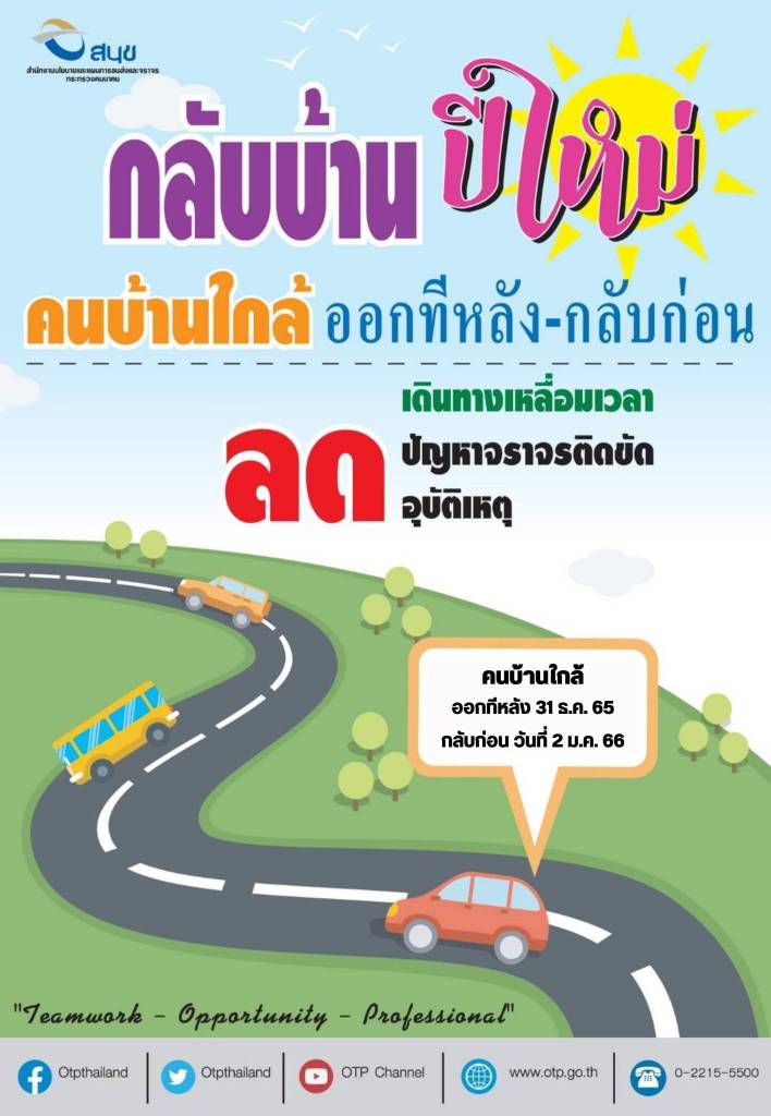 นอกจากนี้ สนข. ได้คาดการณ์ว่าในช่วง 7 วันของเทศกาลปีใหม่ พ.ศ. 2566 จะมีปริมาณจราจรขาเข้าและขาออกกรุงเทพมหานครบนทางหลวงสายหลัก 5 เส้นทาง ในสายเหนือ อีสาน ตะวันออก ตะวันตกและใต้ รวม 4.79 ล้านคัน ดังนั้นเพื่อบริหารการจราจรให้เกิดความคล่องตัว กระทรวงคมนาคมรณรงค์ให้ประชาชนวางแผนการเดินทางล่วงหน้า เพื่อกระจายการเดินทางและเหลื่อมเวลาการเดินทางในเส้นทางเข้า - ออกกรุงเทพมหานคร โดยขอความร่วมมือให้ผู้ที่มีภูมิลำเนาบ้านใกล้ (ระยะทาง 200 - 300 กิโลเมตร จากกรุงเทพมหานคร) เดินทางออกจากกรุงเทพทีหลัง และเดินทางกลับเข้ากรุงเทพก่อน โดยเดินทางออกจากกรุงเทพมหานคร ตั้งแต่วันที่ 30 ธันวาคม 2565 และกลับเข้ากรุงเทพมหานคร ก่อนวันที่ 2 มกราคม 2566 ซึ่ง สนข. คาดการณ์ว่าหากประชาชนให้ความร่วมมือดำเนินการตามมาตรการดังกล่าวจะช่วยลดปริมาณการจราจรที่เกินกว่าความจุของถนนทั้งขาออกและขาเข้าได้ร้อยละ 75 และ 25 ตามลำดับ ทั้งนี้ หน่วยงานในสังกัดกระทรวงคมนาคมได้เสนอมาตรการจูงใจให้ประชาชนวางแผนการเดินทาง เช่น บขส. ลดค่าโดยสาร 10 % ทุกเส้นทาง สำหรับผู้โดยสารที่จองตั๋วล่วงหน้าผ่านช่องทางออนไลน์