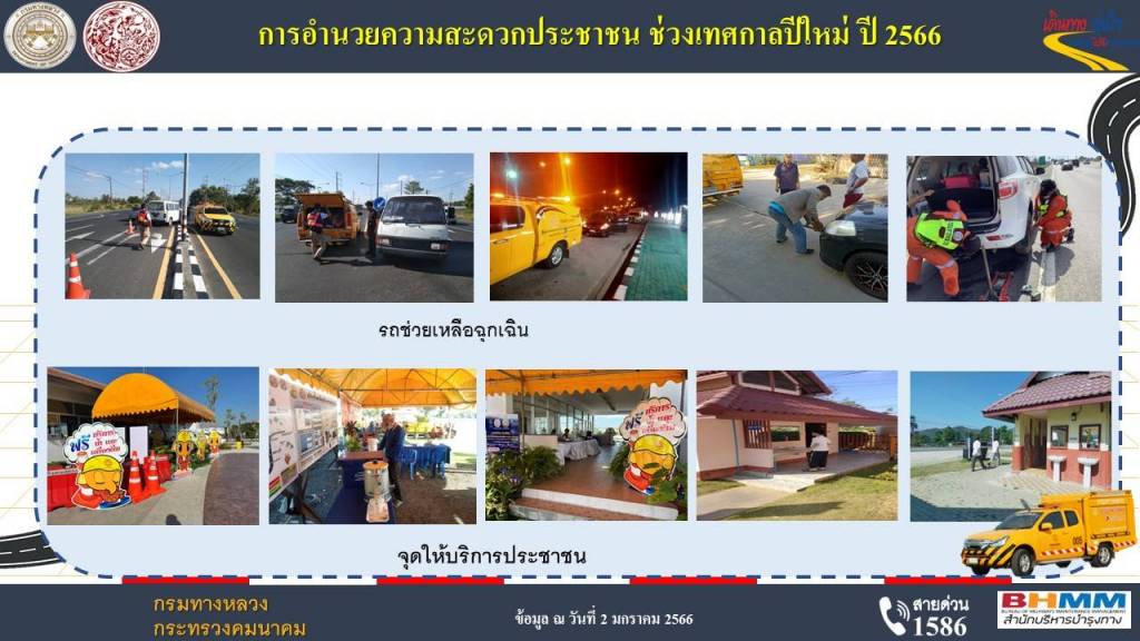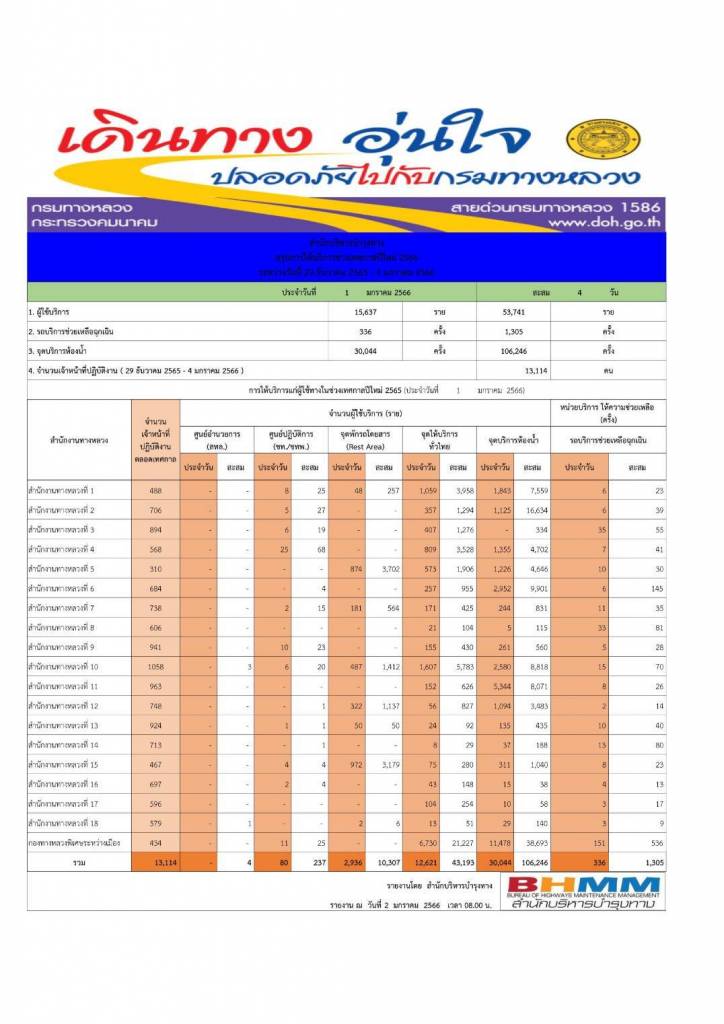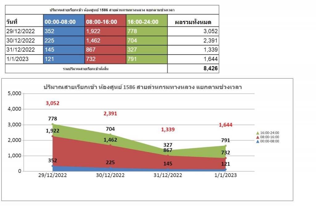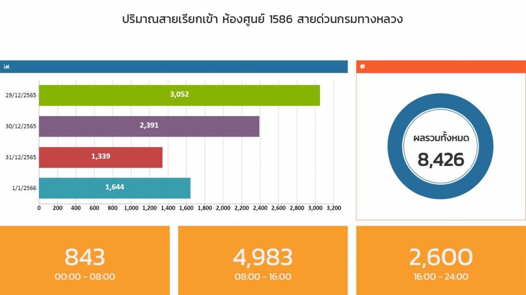 - ยอดการให้บริการสายด่วนกรมทางหลวง 1586 ยอดสะสมตั้งแต่วันที่ 29 ธันวาคม 2565 - 1 มกราคม 2566 มียอดรวมการให้บริการ 8,426 ครั้ง