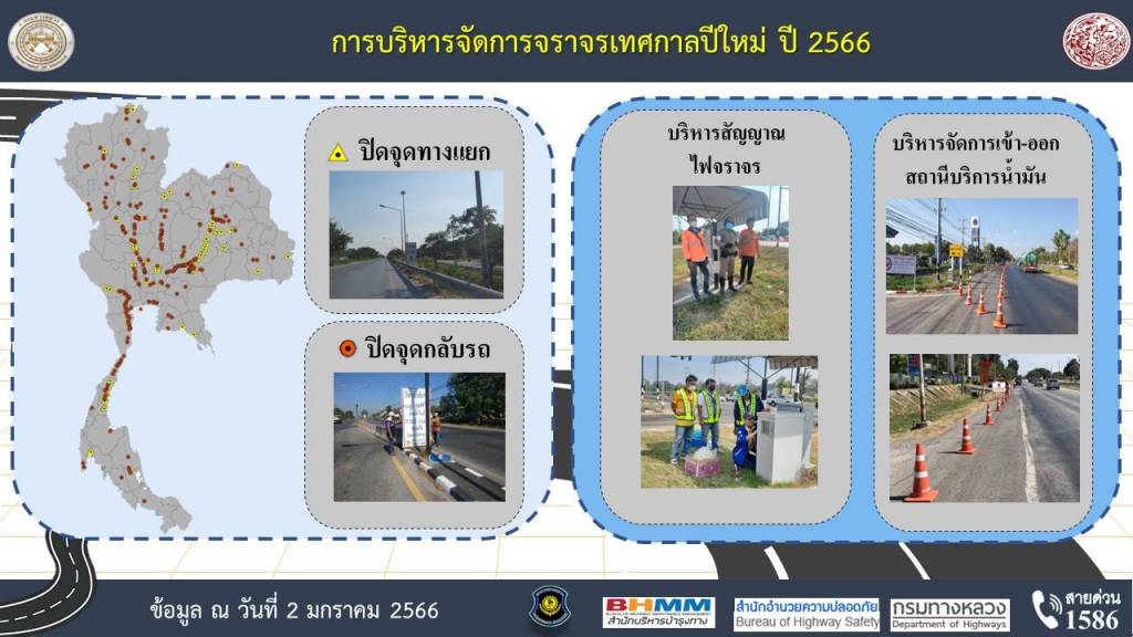 ในด้านการบริหารจัดการสัญญาณไฟจราจรจำนวน 113 แห่ง 16 สายทาง ปิดจุดทางแยก 80 แห่ง 26 สายทาง ปิดจุดกลับรถ 234 แห่ง 47 สายทาง รวมทั้งบริหารจัดการทางเข้า - ออกบริเวณสถานีบริการน้ำมันจำนวน 24 จังหวัด 69 แห่ง นอกจากนี้มีการเปิดช่องทางพิเศษบนทางสายหลักจำนวน 6 สายทาง ได้แก่ ทล.1 , ทล.2 , ทล. 204 , ทล.32 , ทล.304 และ ทล.348 เพื่อความคล่องตัวในการใช้รถใช้ถนนและช่วยป้องกันอุบัติเหตุบนทางหลวง