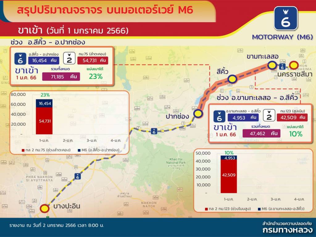 สำหรับปริมาณรถที่ใช้บริการทางหลวงพิเศษสายบางปะอิน - นครราชสีมา (M6) ช่วง ปากช่อง – สีคิ้ว - ขามทะเลสอ ระยะทาง 64 กิโลเมตร ซึ่งเปิดให้บริการเป็นการชั่วคราวทิศทางเดียว (วันเวย์) สำหรับรถขาออกระหว่างวันที่ 29 - 31 ธันวาคม 2565 มียอดผู้ใช้บริการสะสม 3 วัน รวม 62,929 คัน และสำหรับรถขาเข้าระหว่างวันที่ 1 - 4 มกราคม 2566 พบว่าเมื่อวันที่ 1 มกราคม 2566 ซึ่งเปิดให้บริการขาเข้าเป็นวันแรก มีรถใช้บริการทั้งสิ้น 16,454 คัน โดยแบ่งเป็นรถที่ขึ้นใช้บริการจากขามทะเลสอ 4,953 คัน และขึ้นใช้บริการจากสีคิ้ว 11,501 คัน โดยช่วงปากช่อง-สีคิ้ว สามารถแบ่งเบาปริมาณจราจรขาเข้าบนทางหลวงหมายเลข 2 (ถนนมิตรภาพ) บริเวณ กม.75 ช่วงลำตะคอง ได้ 23 %