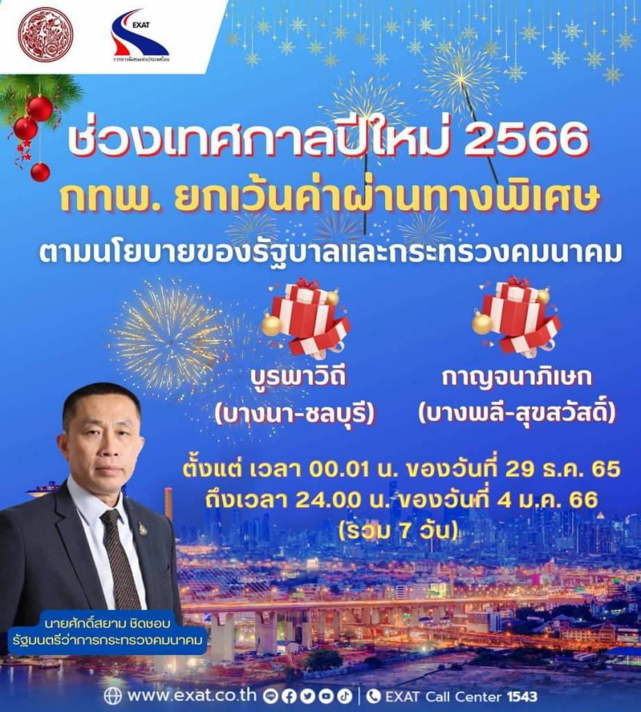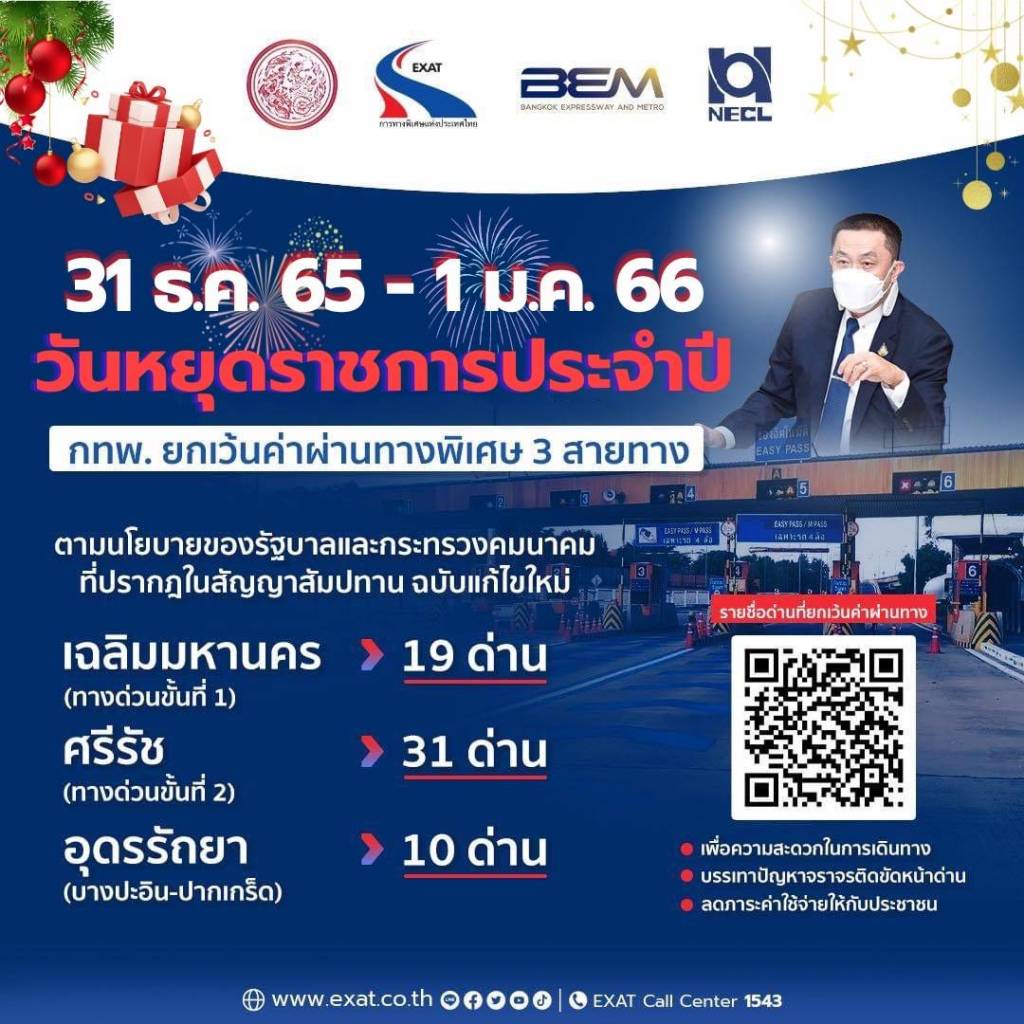 ■ ยกเว้นการจัดเก็บค่าธรรมเนียมในช่วงเทศกาลปีใหม่ 2566 เป็นเวลา 7 วัน (วันที่ 29 ธันวาคม 2565 - 4 มกราคม 2566 ) สำหรับมอเตอร์เวย์ 2 เส้นทาง ได้แก่ หมายเลข 7 (กรุงเทพมหานคร - เมืองพัทยา) และหมายเลข 9 (สายวงแหวนรอบนอกกรุงเทพมหานคร ถนนกาญจนาภิเษก ตอนบางปะอิน - บางพลี และตอนพระประแดง - บางแค ช่วงพระประแดง - ต่างระดับบางขุนเทียน) และทางพิเศษ 2 เส้นทาง ได้แก่ ทางพิเศษบูรพาวิถีและกาญจนาภิเษก นอกจากนี้ทางพิเศษอีก 3 เส้นทาง ได้แก่ ทางพิเศษศรีรัช อุดรรัถยา และเฉลิมมหานคร ยกเว้นค่าธรรมเนียมเป็นเวลา 2 วัน (วันที่ 31 ธันวาคม 2565 - 1 มกราคม 2566)