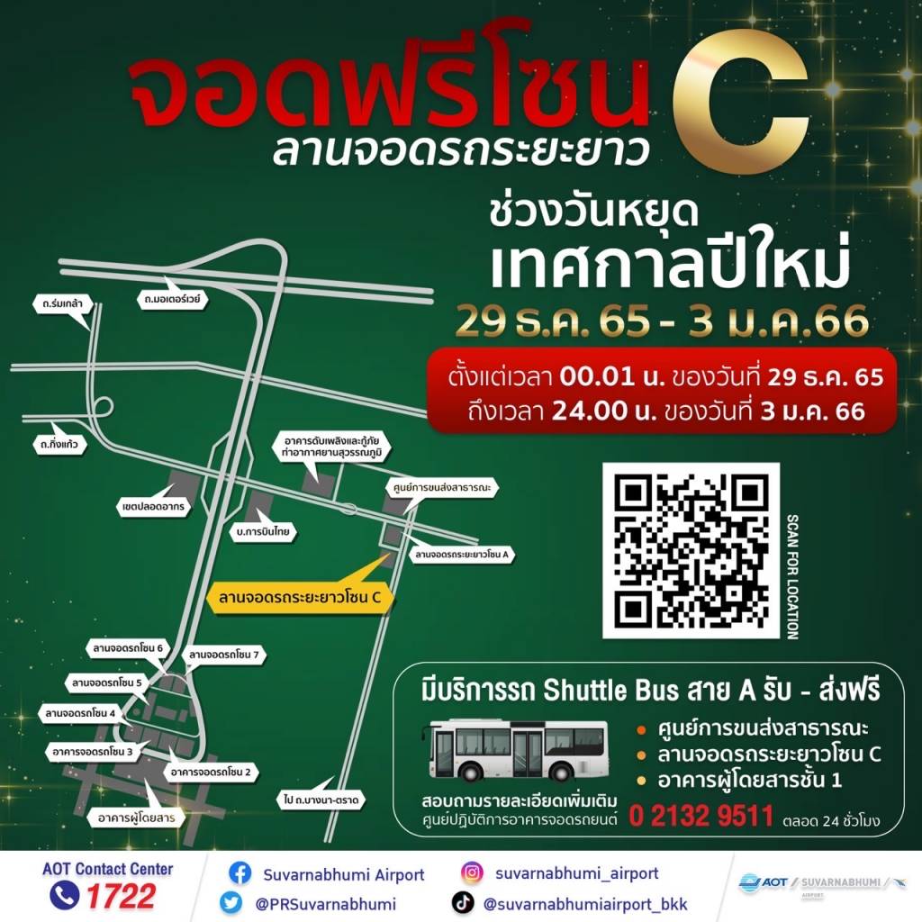 ■ บริการที่จอดรถฟรี ณ ท่าอากาศยานสุวรรณภูมิ บริเวณลานจอดรถยนต์ระยะยาว โซน C เป็นเวลา 7 วัน (วันที่ 29 ธันวาคม 2565 - 4 มกราคม 2566)