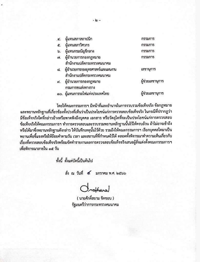 ทั้งนี้ ตามที่มีกระแสข่าวปรากฏในสื่อมวลชนแขนงต่าง ๆ รวมทั้งโซเชียลมีเดีย กระทรวงคมนาคมได้มีคำสั่ง ณ วันที่ 4 มกราคม 2566 แต่งตั้งคณะกรรมการพิจารณาตรวจสอบข้อเท็จจริงการก่อสร้างในโครงการปรับปรุงป้ายชื่อสถานีกลางบางซื่อเป็นสถานีกลางกรุงเทพอภิวัฒน์และตราสัญลักษณ์ของการรถไฟแห่งประเทศไทย โดยมี รองปลัดกระทรวงคมนาคม หัวหน้ากลุ่มภารกิจด้านการขนส่ง เป็นประธานกรรมการ อธิบดีกรมการขนส่งทางราง เป็นรองประธานกรรมการ และผู้แทนจากหน่วยงานภายนอกที่เกี่ยวข้อง ประกอบด้วย วิศวกรรมสถานแห่งประเทศไทย สภาสถาปนิก สภาวิศวกร และกรมบัญชีกลางร่วมเป็นกรรมการ โดยให้มีหน้าที่และอำนาจในการรวบรวมข้อเท็จจริง ข้อกฎหมาย และพยานหลักฐานที่เกี่ยวข้องที่เห็นว่าเป็นประโยชน์แก่การตรวจสอบข้อเท็จจริง ในกรณีที่ปรากฏว่า มีข้อเท็จจริงใดที่กล่าวอ้างหรือพาดพิงถึงบุคคล เอกสาร หรือวัตถุใดที่จะเป็นประโยชน์แก่การตรวจสอบข้อเท็จจริงให้คณะกรรมการฯ ทำการตรวจสอบและรวบรวมพยานหลักฐานนั้นไว้ให้ครบถ้วน ถ้าไม่อาจเข้าถึงหรือได้มาซึ่งพยานหลักฐานดังกล่าว ให้บันทึกเหตุนั้นไว้ด้วย รวมถึงให้คณะกรรมการฯ เรียกบุคคลใดมาเป็นพยานเพื่อชี้แจงหรือให้ถ้อยคำตามวัน เวลา และสถานที่ที่กำหนดไว้ได้ ตลอดทั้งพิจารณาทำความเห็นเกี่ยวกับเรื่องที่ตรวจสอบข้อเท็จจริง โดยให้รายงานผลการสอบสวนภายใน 15 วัน