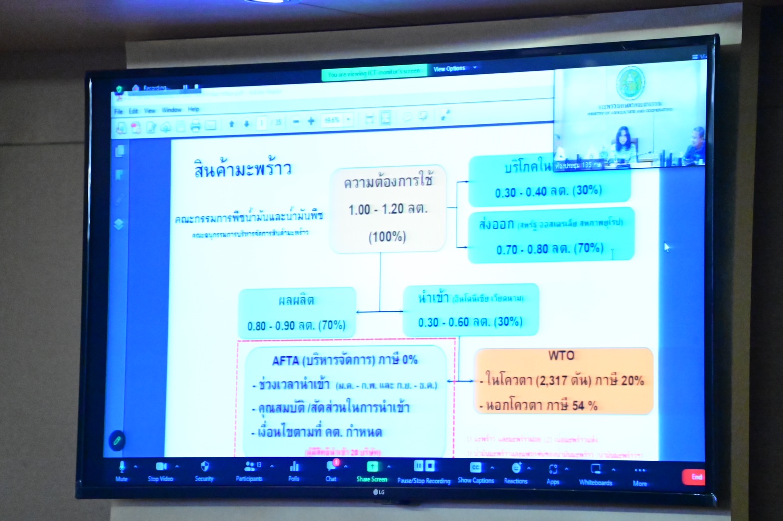 นายระพีภัทร์ จันทรศรีวงศ์ อธิบดีกรมวิชาการเกษตร กล่าวว่า กรมวิชาการเกษตรจะเร่งทำหนังสือตามข้อสั่งการของ รมช.เกษตรฯ ถึง สศก. ภายในอาทิตย์หน้า เพื่อให้ทันนำเข้าที่ประชุม คกก.พืชน้ำมันฯ ที่อยู่ระหว่างการนัดประชุมเพื่อพิจารณากรณีดังกล่าว โดยในการประชุมกรมการค้าต่างประเทศรายงานว่า คกก.พืชน้ำมันฯ ได้อนุมัติให้นำเข้ามะพร้าวตามกรอบ WTO และ AFTA แบ่งเป็น 1. ตามกรอบ AFTA อนุมัติปริมาณ 64,615 ตันต่อปี โดยมีการนำเข้าจริงปริมาณ 5,348.44 ตัน และ 2. ตามกรอบ WTO อนุมัติปริมาณ 2,317 ตัน ปัจจุบันนำเข้าเต็มจำนวนแล้ว รวม 2 กรอบ ปริมาณ 7,000 กว่าตัน ซึ่งจะอนุญาตให้เอกชนนำเข้าในช่วงนอกฤดูการผลิตเท่านั้น ดังนั้นสาเหตุที่ราคามะพร้าวตกต่ำจึงไม่เกี่ยวข้องกับมะพร้าวที่นำเข้าตามโควต้า แต่น่าจะมาจากการนำเข้านอกโควต้า เนื่องจากกรมการค้าต่างประเทศรายงานว่า มียอดนำเข้ามะพร้าว ม.ค. - พ.ย. 65 รวม 130,000 ตัน ซึ่งเป็นการนำเข้านอกโควต้า WTO ที่เสียภาษีร้อยละ 54