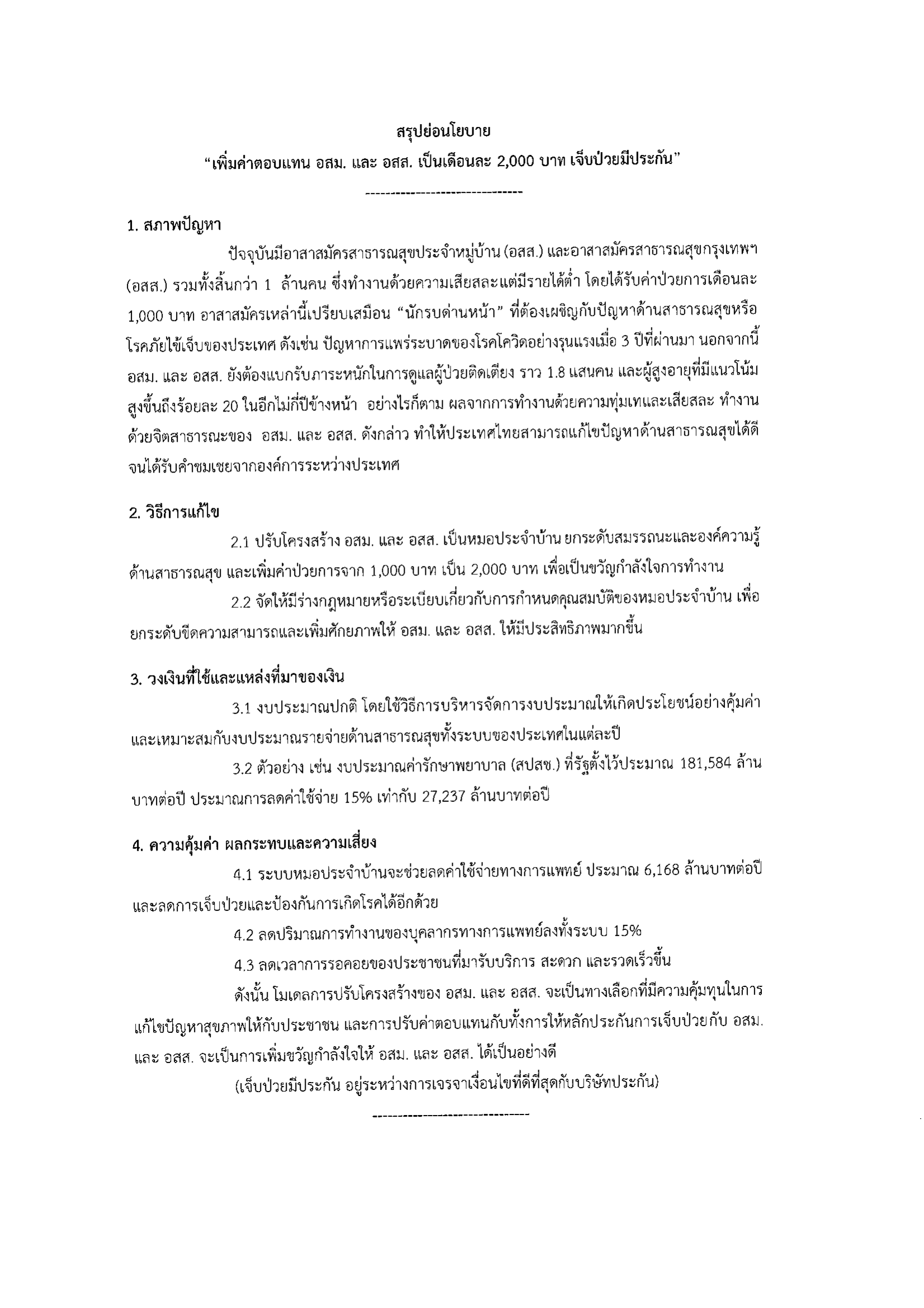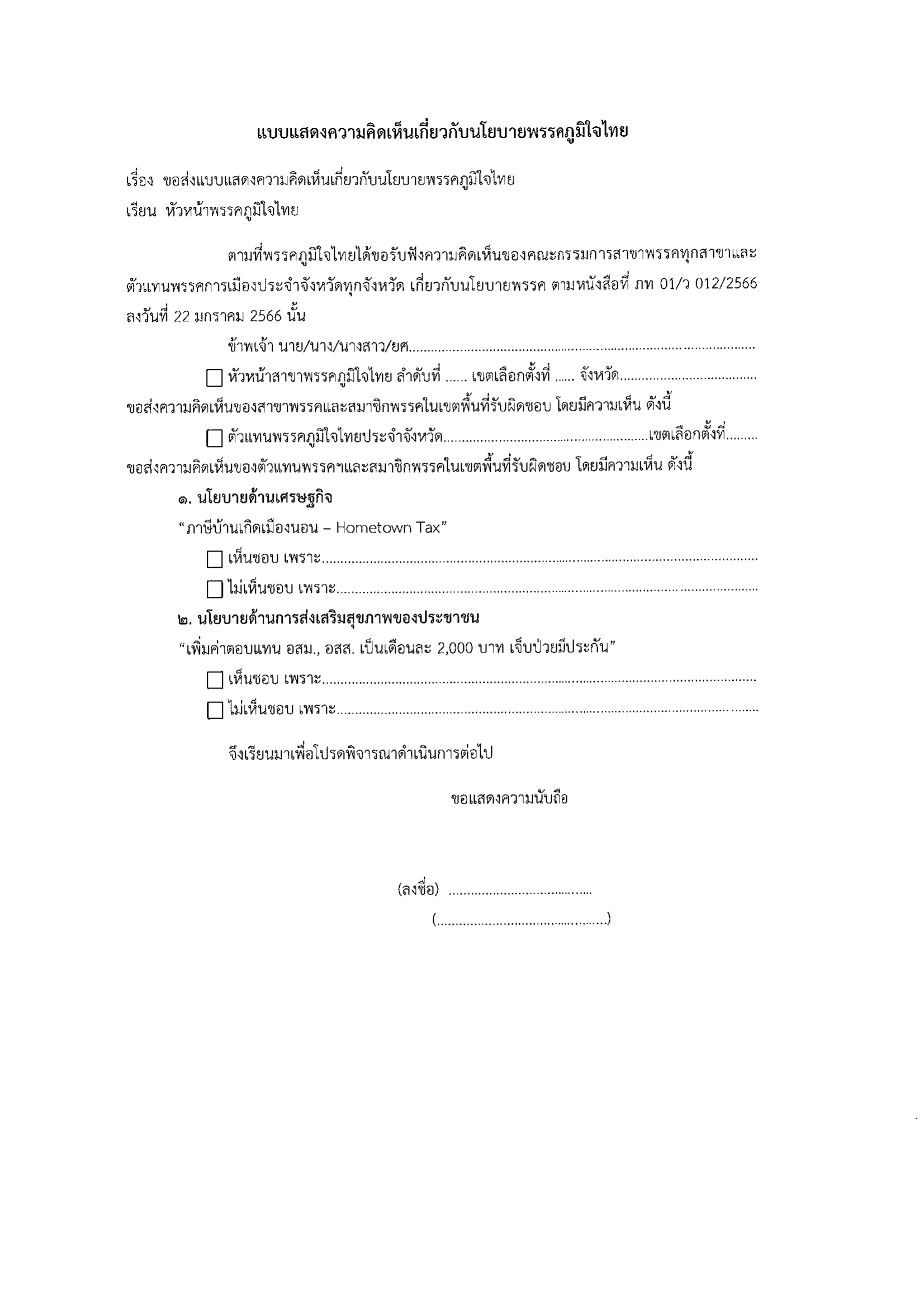 เรื่อง ขอรับฟังความคิดเห็นเกี่ยวกับนโยบายพรรคภูมิใจไทย