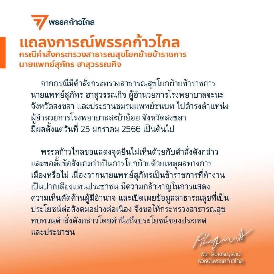 ล่าสุด พรรคก้าวไกลออกแถลงการณ์คัดค้านการย้ายแพทย์สุภัทร ฮาสุวรรณกิจ ผู้อำนวยการโรงพยาบาลจะนะ และประธานชมรมแพทย์ชนบท ไปดำรงตำแหน่งผู้อำนวยการโรงพยาบาลสะบ้าย้อย จังหวัดสงขลา มีผลตั้งแต่วันที่ 25 มกราคม 2566 เป็นต้นไป โดยตั้งข้อสงสัยว่าเป็นการย้าย ที่มีเรื่องของ “การเมือง” แอบแฝง และลงชื่อหัวหน้าพรรค คุณพิธา ว่ารับทราบกับแถลงการณ์ฉบับนี้