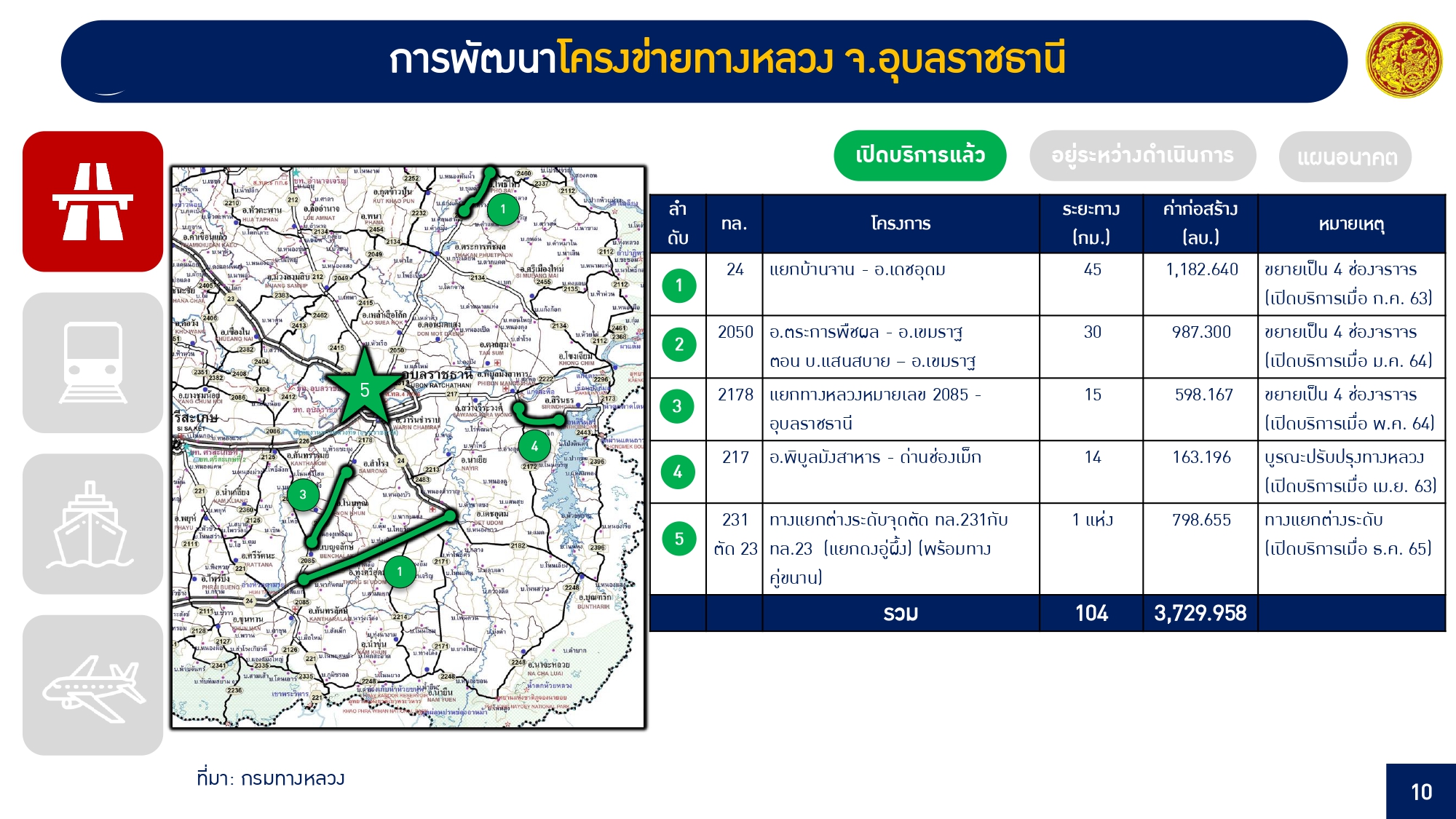 ทั้งนี้ เมื่อโครงการก่อสร้างต่าง ๆ ในพื้นที่จังหวัดอุบลราชธานีแล้วเสร็จสมบูรณ์ จะทำให้การเชื่อมต่อด้านคมนาคมขนส่งทุกโหมดการเดินทางได้อย่างไร้รอยต่อ เพิ่มประสิทธิภาพโครงข่ายการคมนาคมขนส่งของภาคตะวันออกเฉียงเหนือ สามารถรองรับปริมาณการเดินทางและคมนาคมขนส่งที่เพิ่มสูงขึ้นในอนาคต เชื่อมโยงโครงข่ายคมนาคมขนส่งกับภูมิภาคอื่น ๆ ได้อย่างสะดวก รวดเร็ว และมีความปลอดภัย อีกทั้งยังเป็นการฟื้นฟูเศรษฐกิจ ส่งเสริมการท่องเที่ยว ยกระดับคุณภาพชีวิตของประชาชนนำไปสู่ความมั่นคง มั่งคั่ง ยั่งยืน ต่อไป