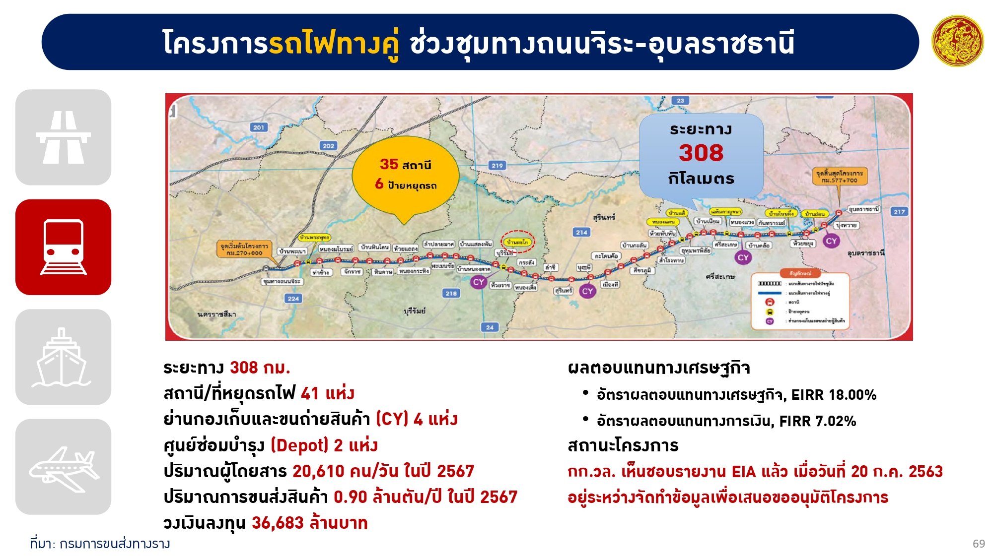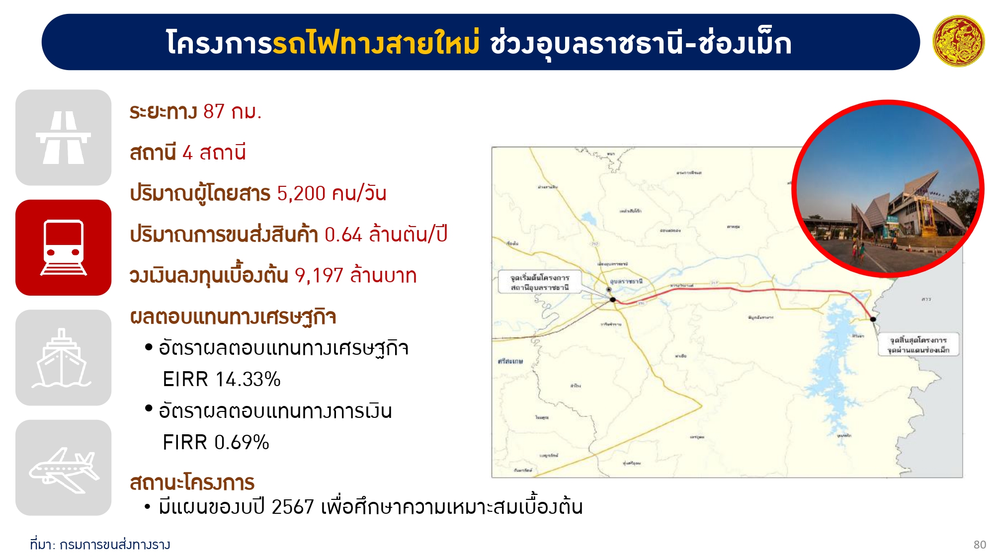 มิติทางราง มีแผนพัฒนารถไฟทางคู่ โครงการรถไฟทางคู่ช่วงชุมทางถนนจิระ-อุบลราชธานี ระยะทาง 308 กิโลเมตร ประกอบด้วยสถานีใหญ่พิเศษ จำนวน 4 สถานี สถานีขนาดใหญ่ จำนวน 3 สถานี สถานีขนาดกลาง จำนวน 8 สถานี และสถานีขนาดเล็กจำนวน 20 สถานี อยู่ระหว่างจัดทำข้อมูลเพื่อเสนอขออนุมัติโครงการ และโครงการรถไฟทางสายใหม่ ช่วงอุบลราชธานี-ช่องเม็ก มีแผนของบประมาณปี 2567