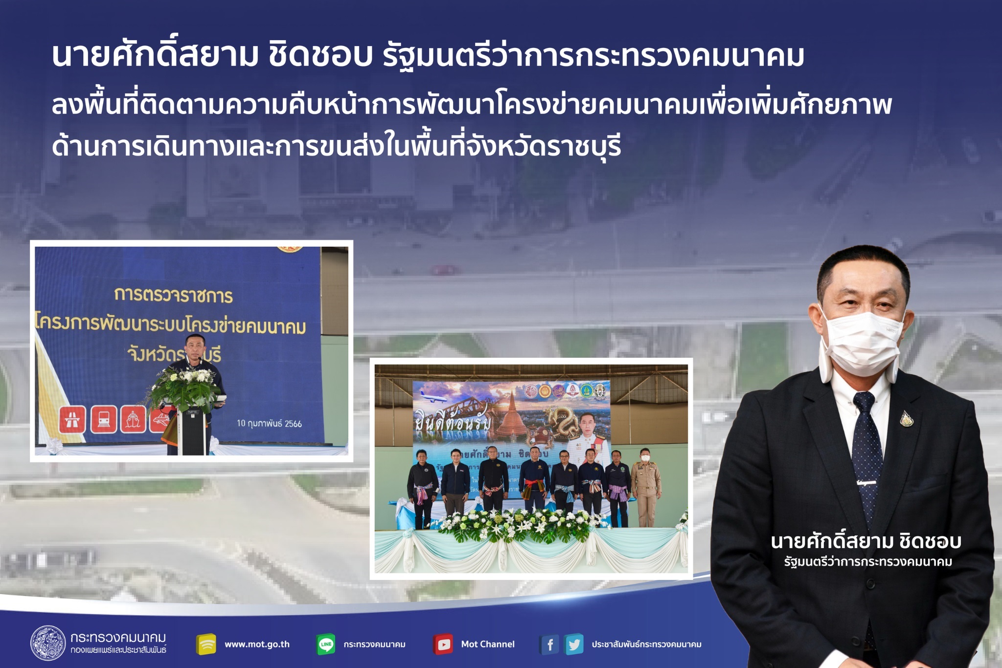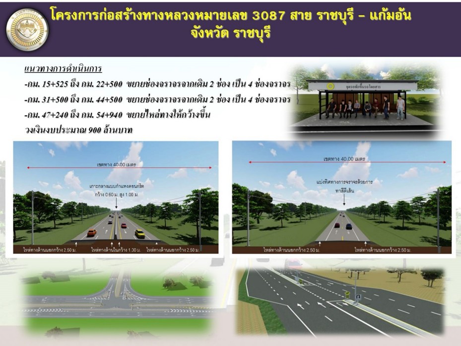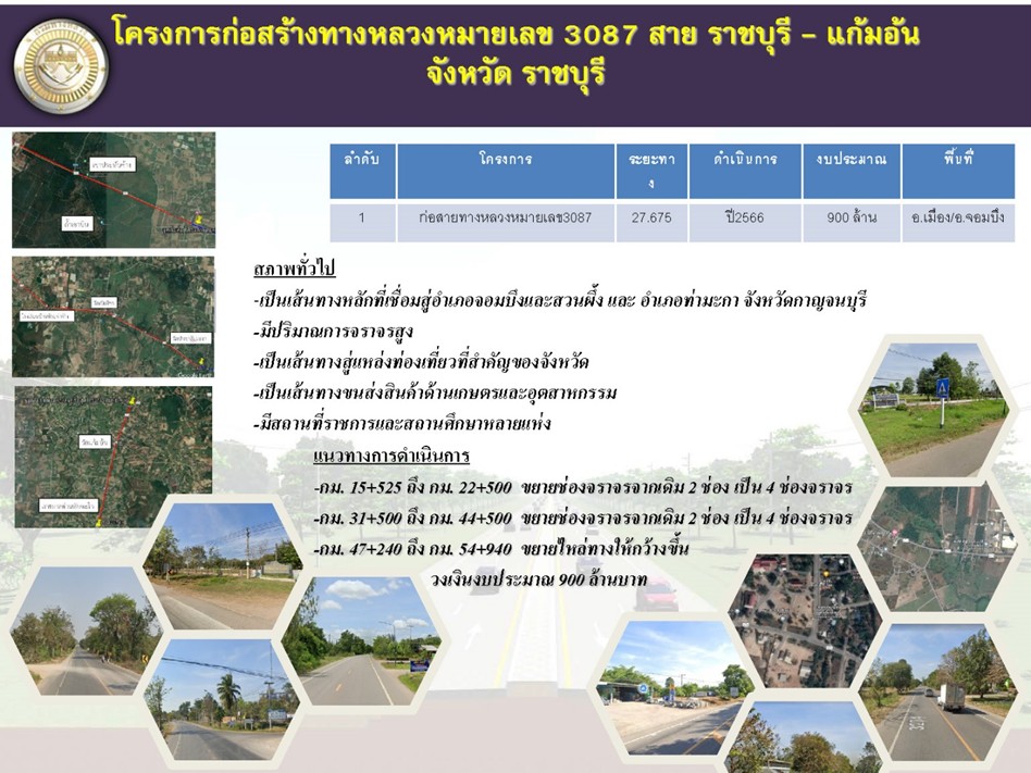 นายศักดิ์สยาม ชิดชอบ กล่าวว่า ตามนโยบายของรัฐบาลภายใต้การนำของ พลเอก ประยุทธ์ จันทร์โอชา นายกรัฐมนตรี ในการเร่งรัดพัฒนาโครงสร้างพื้นฐานด้านคมนาคมขนส่งให้ครอบคลุมทั่วถึงทุกพื้นที่ สนับสนุนการพัฒนาเศรษฐกิจในพื้นที่และเศรษฐกิจของประเทศอย่างยั่งยืน โดยการลงพื้นที่จังหวัดราชบุรีครั้งนี้กระทรวงคมนาคม ได้ติดตามความคืบหน้าของโครงการสำคัญต่าง ๆ ของหน่วยงานในสังกัด และตรวจพื้นที่โครงการขอรับจัดสรรงบประมาณการก่อสร้าง ประจำปี 2566 ซึ่งอยู่ระหว่างดำเนินการ เพื่อเพิ่มประสิทธิภาพโครงข่ายการคมนาคมขนส่ง พร้อมทั้งเตรียมจัดงบประมาณเพิ่มเติมในปี 2567 ในการพัฒนาโครงข่ายทางหลวงหมายเลข 3087 สายราชบุรี – แก้มอ้น กม.15+525 ถึง กม. 22+500, กม. 31+500 ถึง กม. 44+500, กม. 47+240 ถึง กม. 54+940 ซึ่งเป็นเส้นทางหลักสู่แหล่งท่องเที่ยวสำคัญ เชื่อมต่อระหว่างอำเภอจอมบึง อำเภอสวนผึ้ง จังหวัดราชบุรี และ อำเภอท่ามะกา จังหวัดกาญจนบุรี พร้อมทั้งก่อสร้างจุดรอพักขึ้นรถโดยสาร ปรับปรุงระบบระบายน้ำ ไฟฟ้าแสงสว่างและติดตั้งอุปกรณ์อำนวยความปลอดภัยให้กับประชาชนผู้ใช้ทาง ซึ่งเมื่อโครงการแล้วเสร็จจะทำให้เส้นทางดังกล่าวมีความสะดวก คล่องตัว เพิ่มศักยภาพให้กับภาคเกษตรกรในการขนส่งสินค้าผลผลิต สนับสนุนการเดินทางท่องเที่ยว ส่งเสริมเศรษฐกิจในพื้นที่จังหวัดราชบุรีและจังหวัดใกล้เคียง