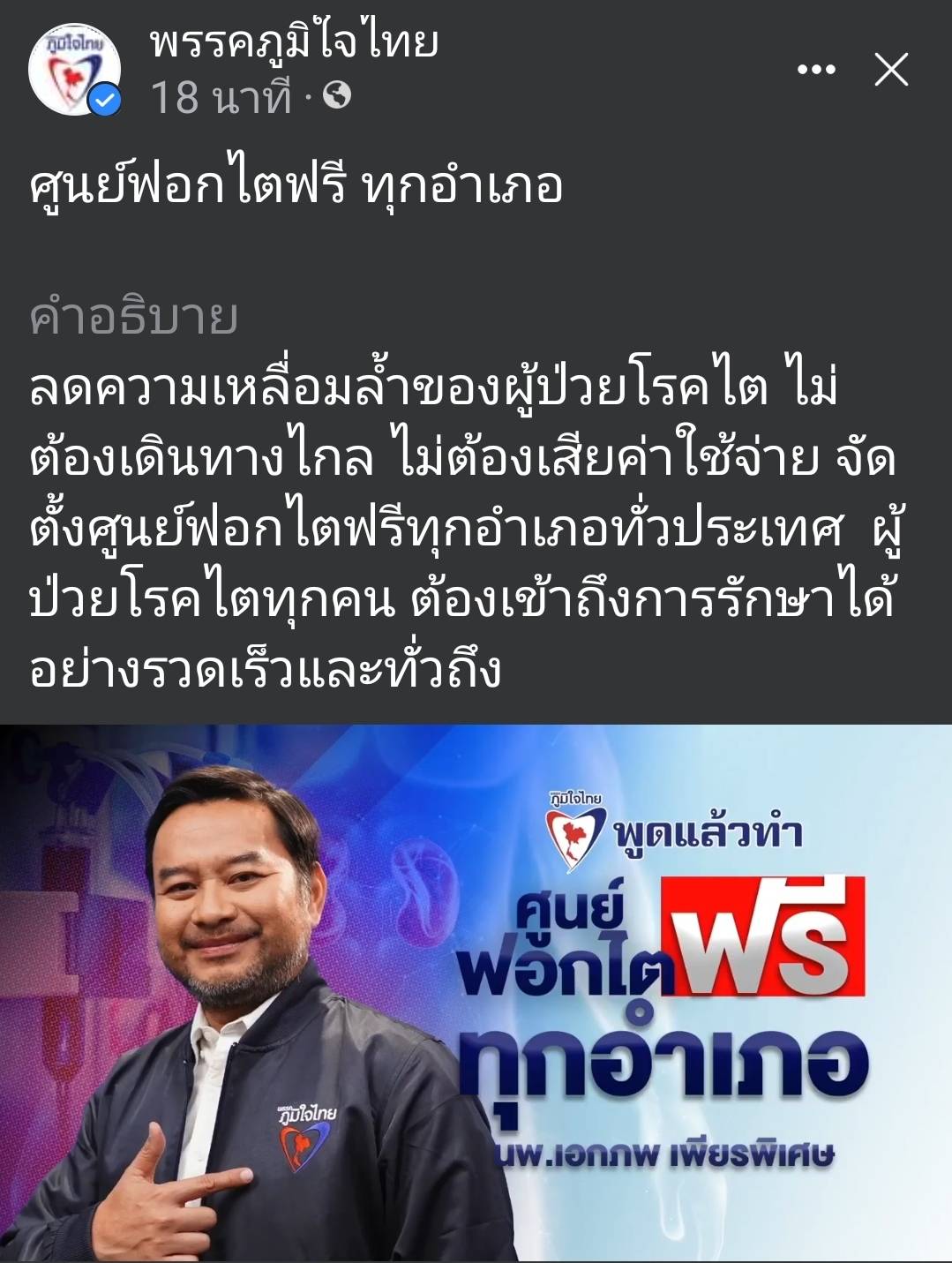 นพ.เอกภพ เพียรพิเศษ ว่าที่ผู้สมัคร ส.ส.เชียงราย เขต 1 พรรคภูมิใจไทย กล่าวในรายการ “พรรคภูมิใจไทย พูดแล้วทำ” เผยแพร่ทางเฟซบุ๊ก และยูทูบพรรคภูมิใจไทย ถึงนโยบาย “ฟอกไตฟรี ทั่วประเทศ” โดยระบุว่า โรคร้ายโรคหนึ่งที่มีผลต่อสุขภาพ และชีวิตของคนไทยเป็นอย่างมาก ก็คือ โรคไตวาย โดยก่อนหน้านี้หลายๆ คนอาจจะไม่ทราบว่า สิทธิในการให้บริการฟอกไตฟรีของโรงพยาบาลรัฐทำได้เฉพาะการฟอกไตทางหน้าท้องเท่านั้น ซึ่งแน่นอนว่า การฟอกไตด้วยเครื่อง ย่อมดีกว่าการฟอกไตทางหน้าท้อง แต่การฟอกไตด้วยเครื่องฟอกไตที่โรงพยาบาล