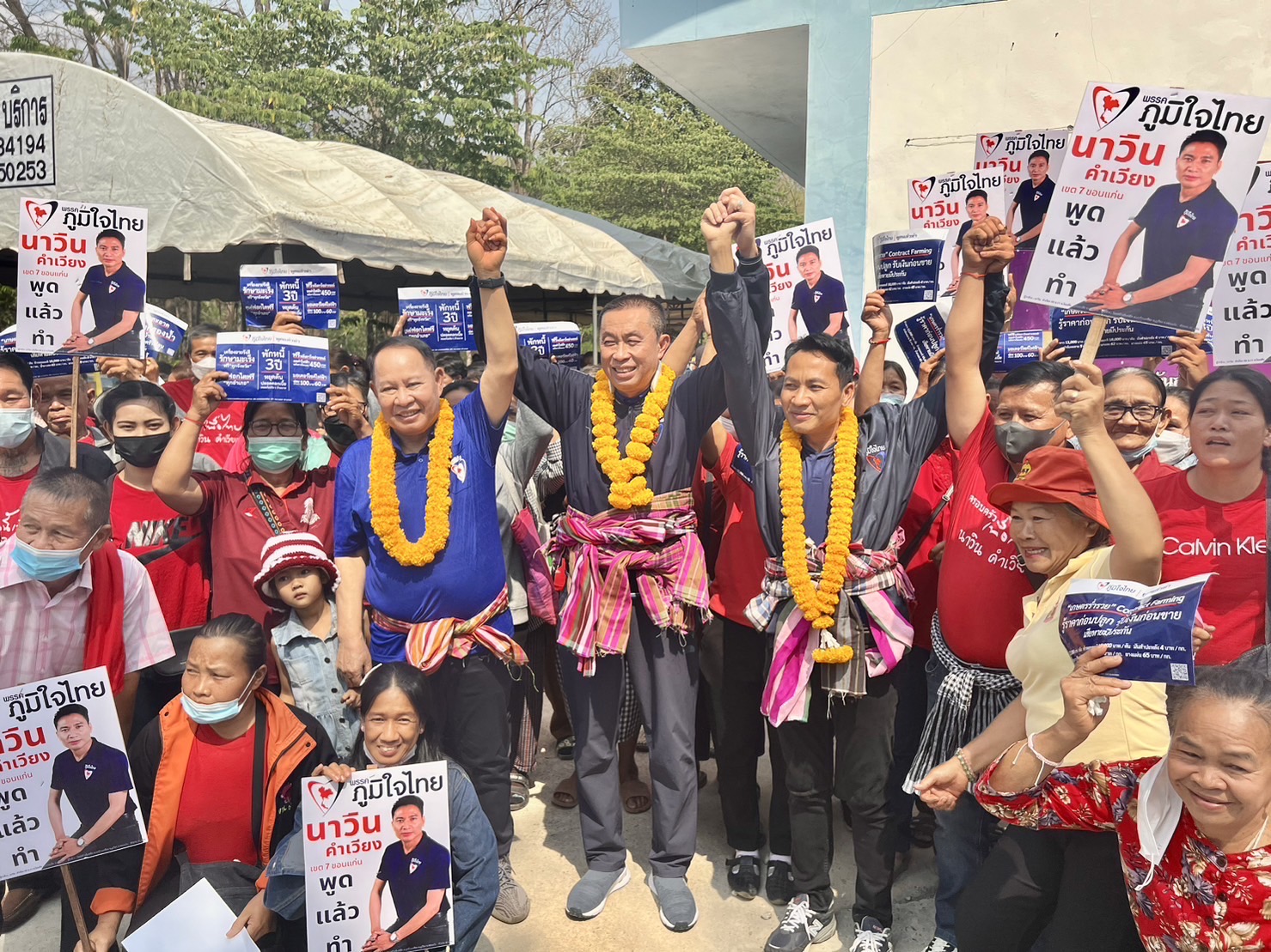 โดยระหว่างการปราศรัยมีเหตุการณ์เซอร์ไพร์ส คือการเปิดตัว นายนาวิน คำเวียง อดีตสมาชิกครอบครัวเพื่อไทยและคนเสื้อแดง ที่จะลงสมัคร ส.ส.เขต 7 ขอนแก่นในนามพรรคภูมิใจไทย ซึ่งประกอบด้วย อำเภอหนองเรือ อำเภอบ้านฝาง อำเภอภูเวียงบางส่วน