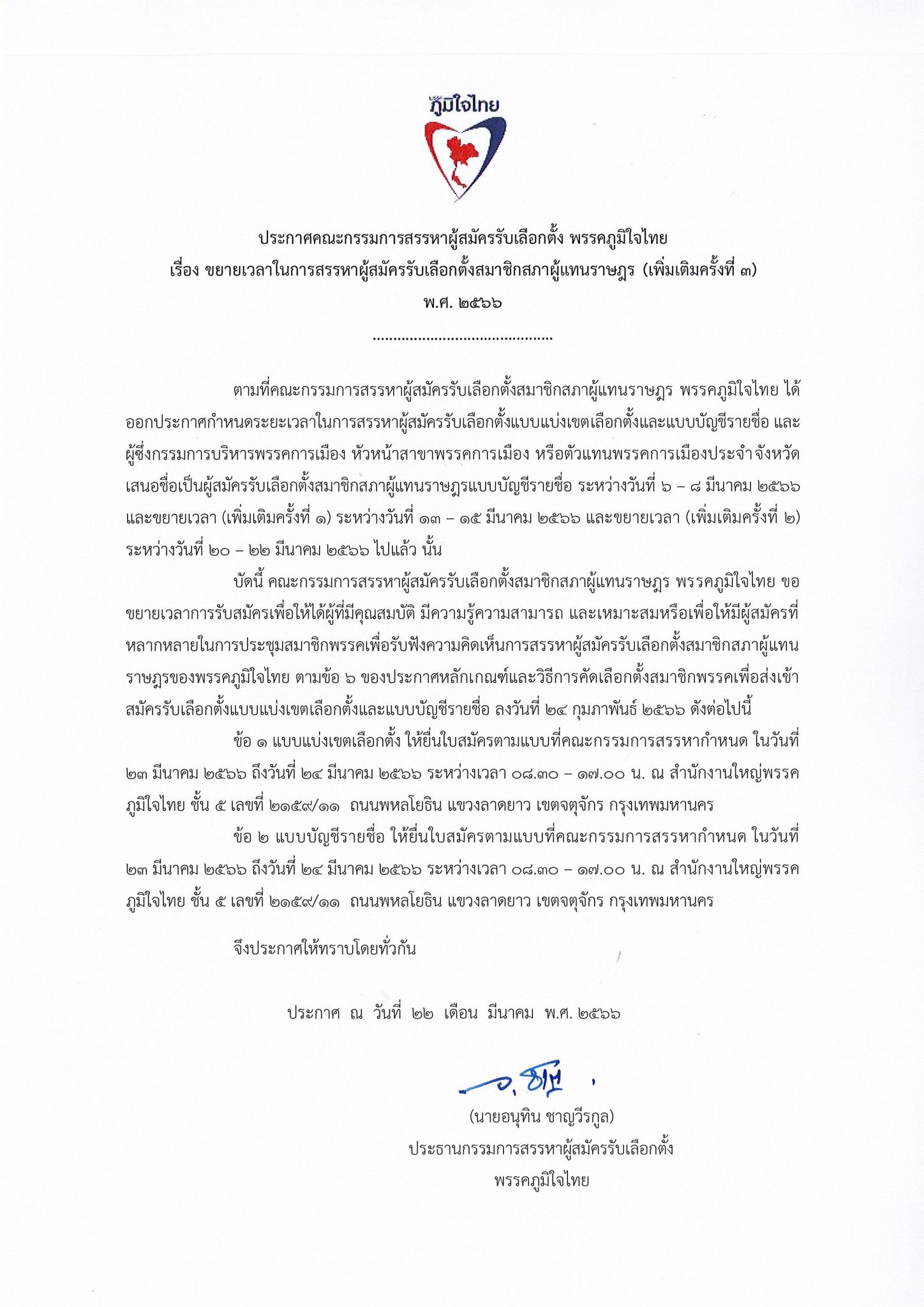 22 มีนาคม 2566 เวลา 08:31เรื่อง ขยายเวลาในการสรรหาผู้สมัครรับเลือกตั้งสมาชิกสภาผู้แทนราษฎร (เพิ่มเติมครั้งที่ ๓)แชร์บทความนี้: