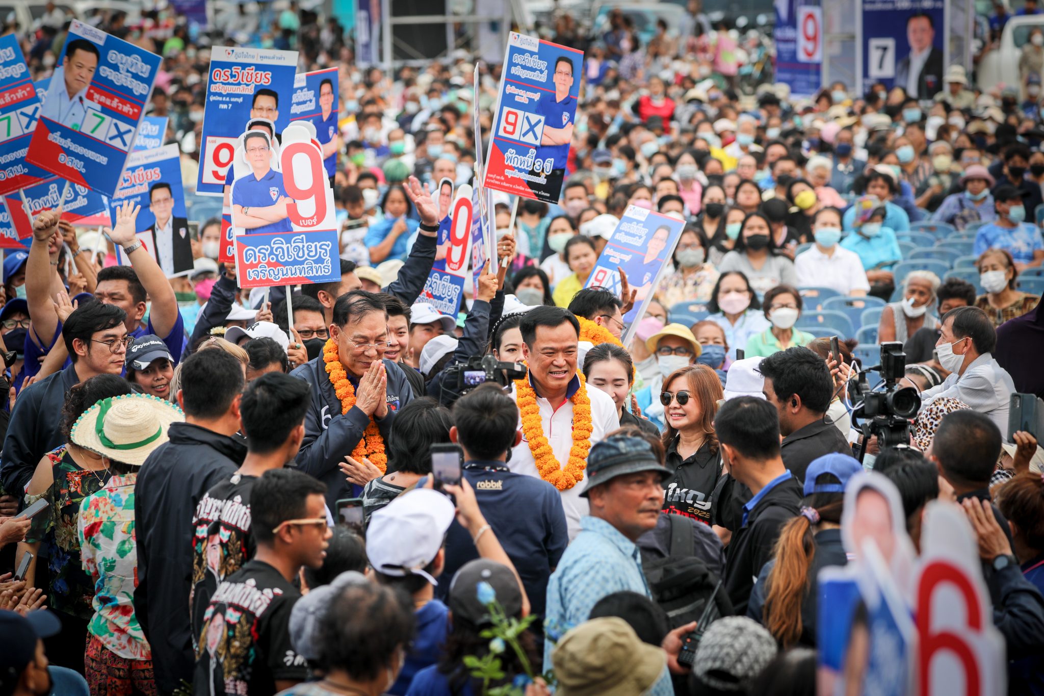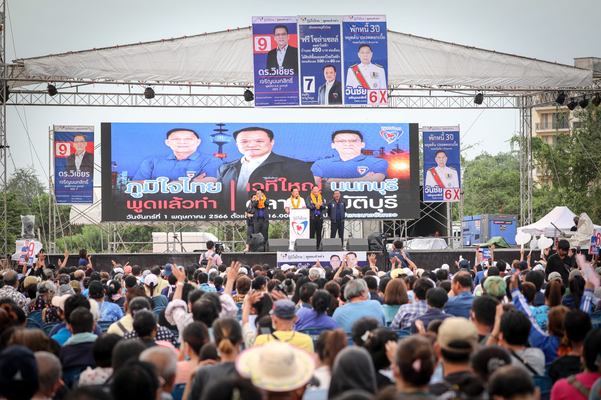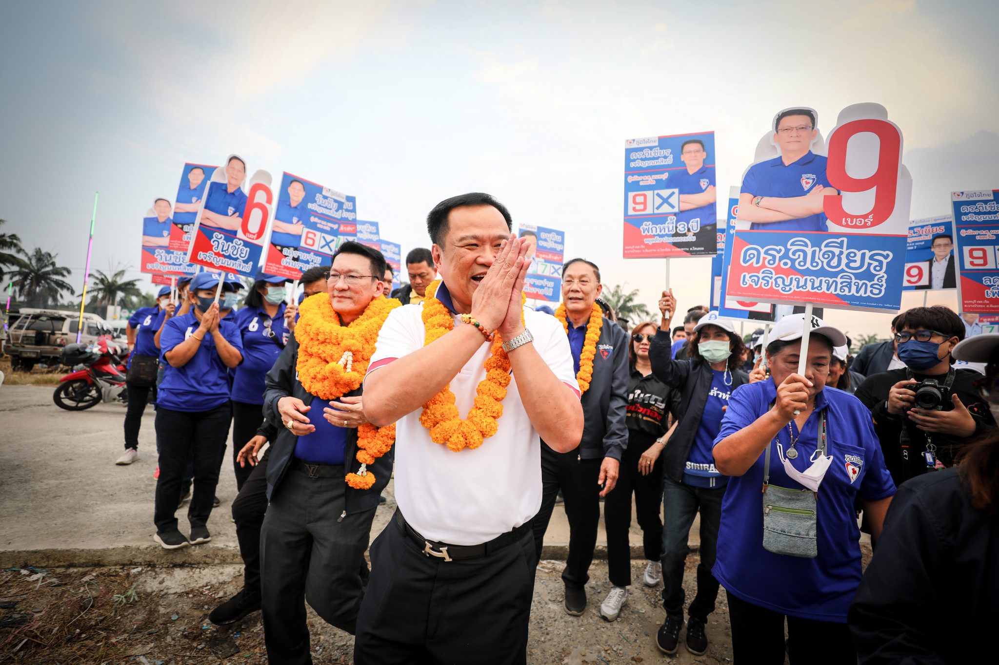 "ท่านวิเชียร ทำงานการเมืองมานาน พี่น้องรู้จักคุ้นเคย ถามว่าจะไม่เอาหรือ พี่วันชัย เบอร์ 6 น้องวิเชียร เบอร์ 9 และอย่าลืมกาเบอร์ 7 พรรคภูมิใจไทย พี่น้องจะได้นายกรัฐมนตรี ควบอีกตำแหน่ง ใช้พวกเราให้เต็มที่ พลังในการขับเคลื่อนทางการเมือง ถึงขนาดย้ายภูเขา ซึ่งจากการลงพื้นที่มา ได้เห็นพี่น้องประชาชน ที่ให้การต้อนรับอบอุ่น มั่นใจว่าจังหวัดนนทบุรีเราจะตอกเสาเข็มได้แน่นอน"