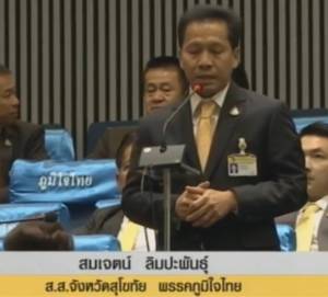 นายสมเจตน์ ลิมปะพันธุ์ ส.ส.สุโขทัย พรรคภูมิใจไทย ถกประเด็นปัญหาความเดือดร้อนของพี่น้องประชาชน หมู่ที่1,4 ต.ศรีสัชนาลัย หมู่ที่ 1, 5, 6, 9 ต.ป่ากุมเกาะ หมู่ที่3 ต.วังพิณพาทย์ หมู่ที่ 1, 2, 5, 10 ต.ย่านยาว หมู่ที่ 3, 7 ต.คลองกระจง และหมู่ที่6 ต.ท่าทอง พี่น้องในเขตพื้นที่ที่ได้กล่าวมานั้น อยู่ริมสองฝั่งแม่น้ำยม พื้นที่เหล่านี้ได้รับผลกระทบจากการกัดเซาะของแม่น้ำสายนี้ในช่วงฤดูน้ำหลาก ทำให้บ้านของพี่น้องประชาชน และถนนริมตลิ่งทรุดตัวลงทำให้เกิดความเสียหาย และส่งผลกระทบต่อพื้นที่เศรษฐกิจ และพื้นที่เกษตรกรรม และส่งผลกระทบต่อสภาพจิตใจของพี่น้องประชาชน นายสมเจตน์ กล่าวว่า อยากให้หน่วยงานที่เกี่ยวข้องได้แก่ กรมเจ้าท่า กรมโยธาธิการและผังเมือง เพื่อจัดสรรงบประมาณการก่อสร้างเขื่อนเพื่อป้องกันการทรุดตัวของตลิ่ง