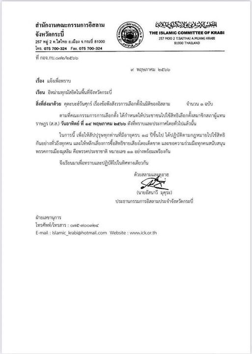 นายศุภชัย ใจสมุทร นายทะเบียนสมาชิกพรรคภูมิใจไทย โพสต์เฟซบุ๊กส่วนตัว โดยนำภาพเอกสารของ สำนักงานคณะกรรมการอิสลาม จังหวัดกระบี่ ที่ กอจ.กบ.072/2566 ลงวันที่ 9 พฤษภาคม 2566 ลงนามโดย อัสนาวี มุคุระ ประธานคณะกรรมการอิสลาม ประจำจังหวัดกระบี่ เรื่องแจ้งเพื่อทราบ โดยส่งไปที่อิหม่ามทุกมัสยิดในพื้นที่จังหวัดกระบี่ พร้อมแนบเอกสาร คุตะบะฮ์วันศุกร์ เรื่องข้อพีงสังวรการเลือกตั้งในมิติอิสลาม 1 ฉบับ มีข้อความว่า เพื่อให้สัปปุรุษทุกท่านที่มีอายุครบ 18 ปีขึ้นไป ได้ปฏิบัติตามกฎหมายไปใช้สิทธิ์กันอย่างทั่วถึงทุกคน และให้หลีกเลี่ยงการซื้อสิทธิ์ขายเสียงโดยเด็ดขาด และขอความร่วมมือทุกคนสนับสนุนพรรคการเมืองมุสลิม คือพรรคประชาชาติ หมายเลข 11 อย่างพร้อมเพรียงกัน จึงเรียนมาเพื่อทราบและปฏิบัติไปในทิศทางเดียวกัน