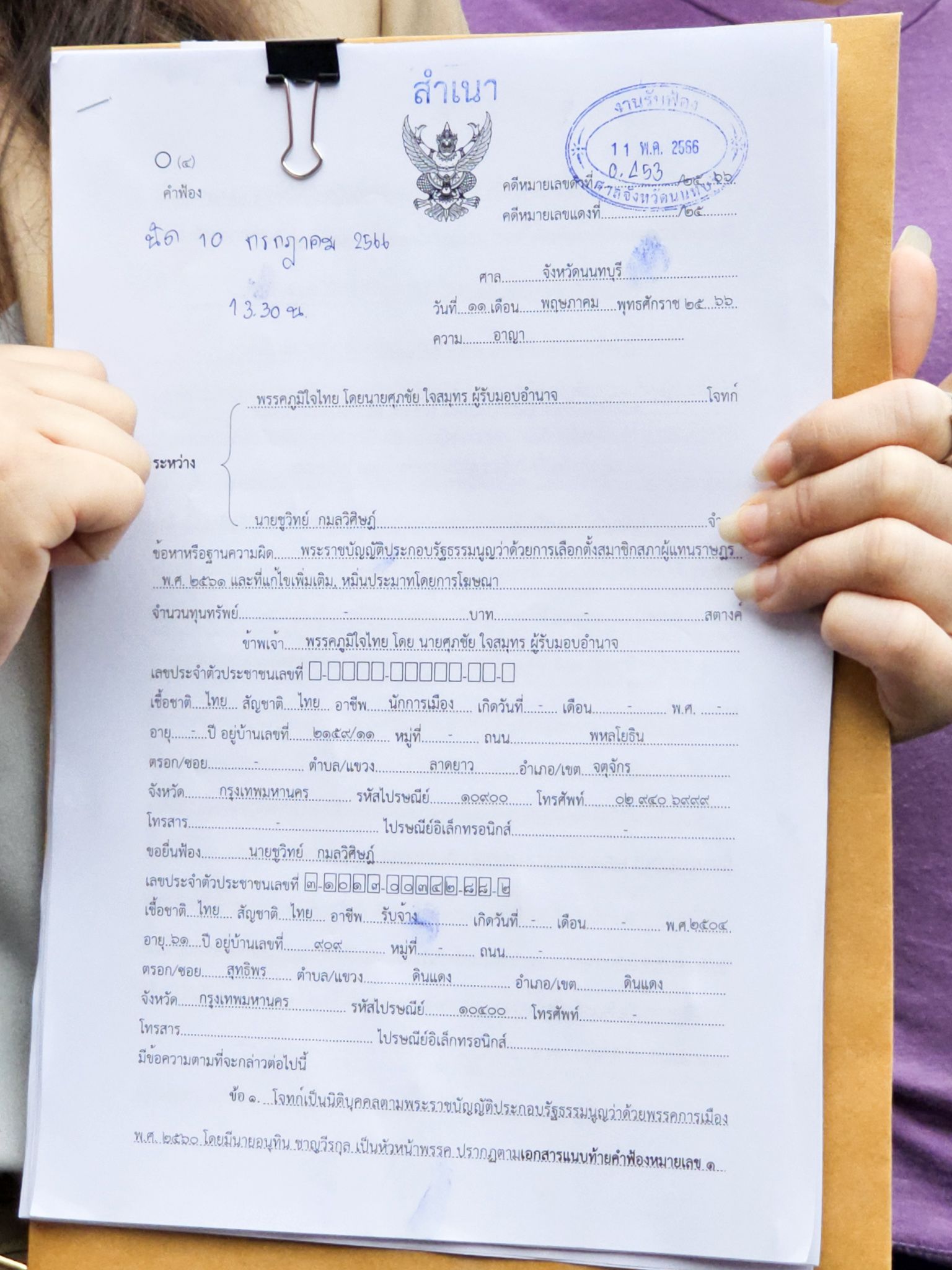 11 พฤษภาคม 2566 น.ส.ประภารัตน์ พิริยะอนันตะกุล ทนายความ รับมอบหมายจากพรรคภูมิใจไทย เดินทางมายังศาลจังหวัดนนทบุรี เพื่อฟ้องดำเนินคดีอาญากับ นายชูวิทย์ กมลวิศิษฎ์ อดีตนักการเมือง หลังจากไปขึ้นเวทีปราศรัยกับพรรคก้าวไกล ที่ตลาดนกฮูก จังหวัดนนทบุรี เมื่อสัปดาห์ที่ผ่านมา