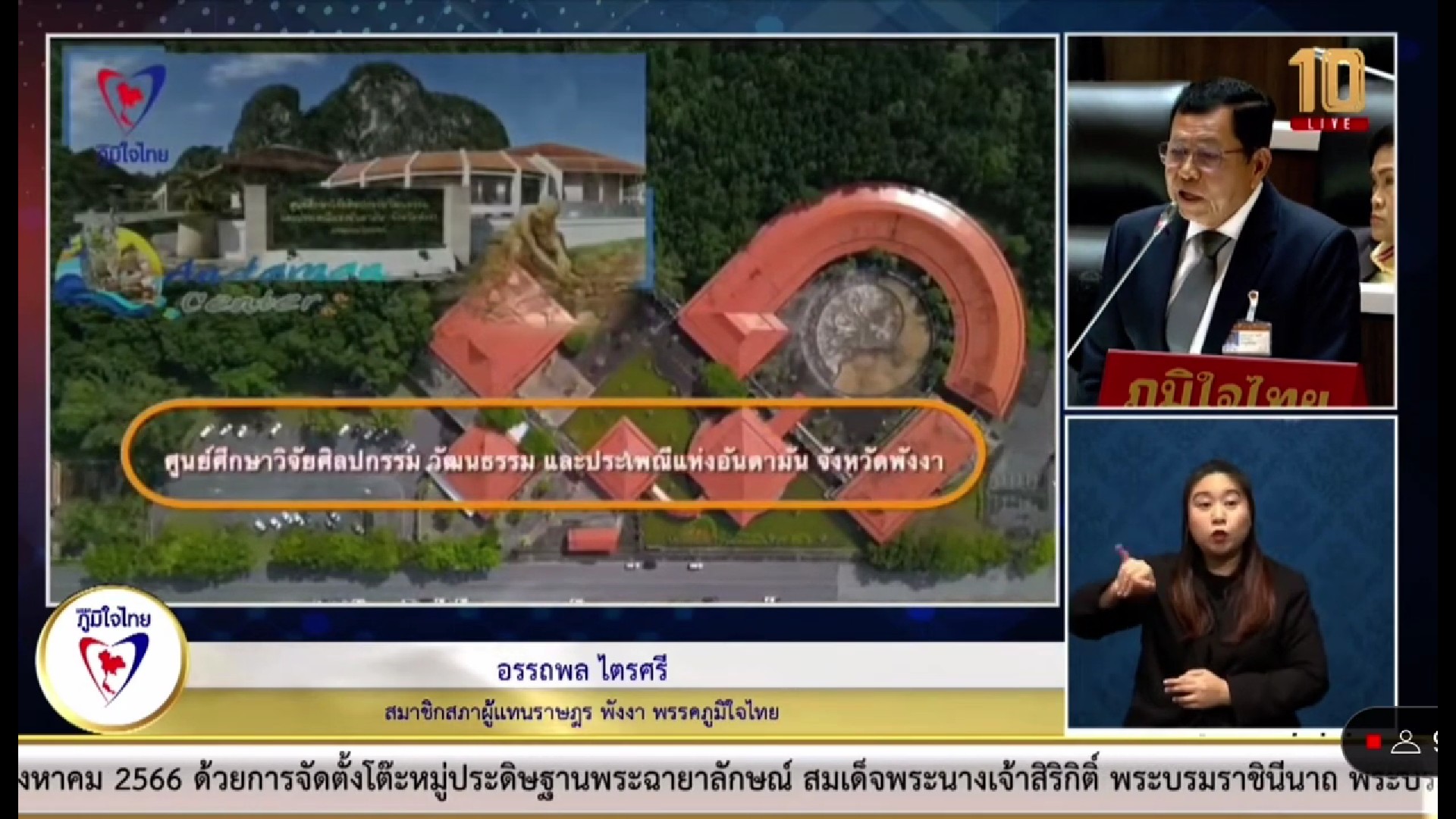 เรื่องถัดไป คือ ได้รับเรื่องจากนายกองค์การบริหารส่วนจังหวัดพังงา เกี่ยวกับอาคารศูนย์จริยธรรมศึกษาพัฒนาการของจังหวัดพังงา เป็นศูนย์ศึกษาวิจัยศิลปกรรม วัฒนธรรม และอันดามัน เป็นการเรียนรู้ของอาคารทั้งหมดเกี่ยวกับจังหวัดภาคใต้ โดยกรมศิลปากรเป็นผู้ออกแบบ และใช้งบประมาณของกระทรวงวัฒนธรรม 188 ล้านบาท แต่ตอนนี้การส่งมอบให้กับ อบจ. ไม่ถูกต้อง โดยได้สร้างเสร็จเมื่อปี 2554 จึงมีเหตุจำเป็นที่จะต้องให้กรมศิลปากรส่งมอบอาคารให้กับกรมธนารักษ์ เพื่อกรมธนารักษ์จะได้ส่งมอบให้กับ อบจ. ต่อไป ทั้งนี้สภาพของอาคารต่างๆ เริ่มทรุดโทรมตามกาลเวลา ทางอบจ. ก็ไม่สามารถที่จะเข้าไปดำเนินการได้ ตั้งงบประมาณในการพัฒนาก็ไม่สามารถเข้าไปซ่อมแซมได้เพราะผิดระเบียบ จึงอยากฝากผ่านไปยังผู้ที่เกี่ยวข้องทั้งหมด โดยเฉพาะกลุ่มศิลปากร, กรมธนารักษ์ และอบจ. ช่วยกันประสานงานให้อาคารนี้เป็นที่เชิดชูการท่องเที่ยว และอยู่ในเขตของการท่องเที่ยวต่อไป