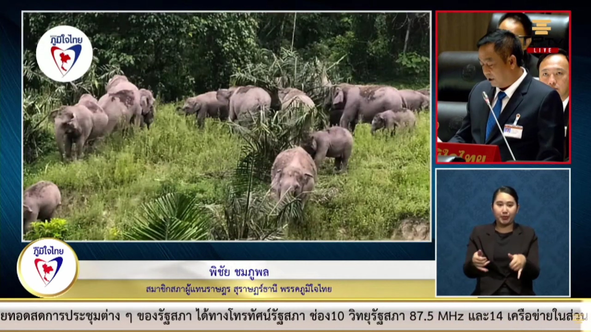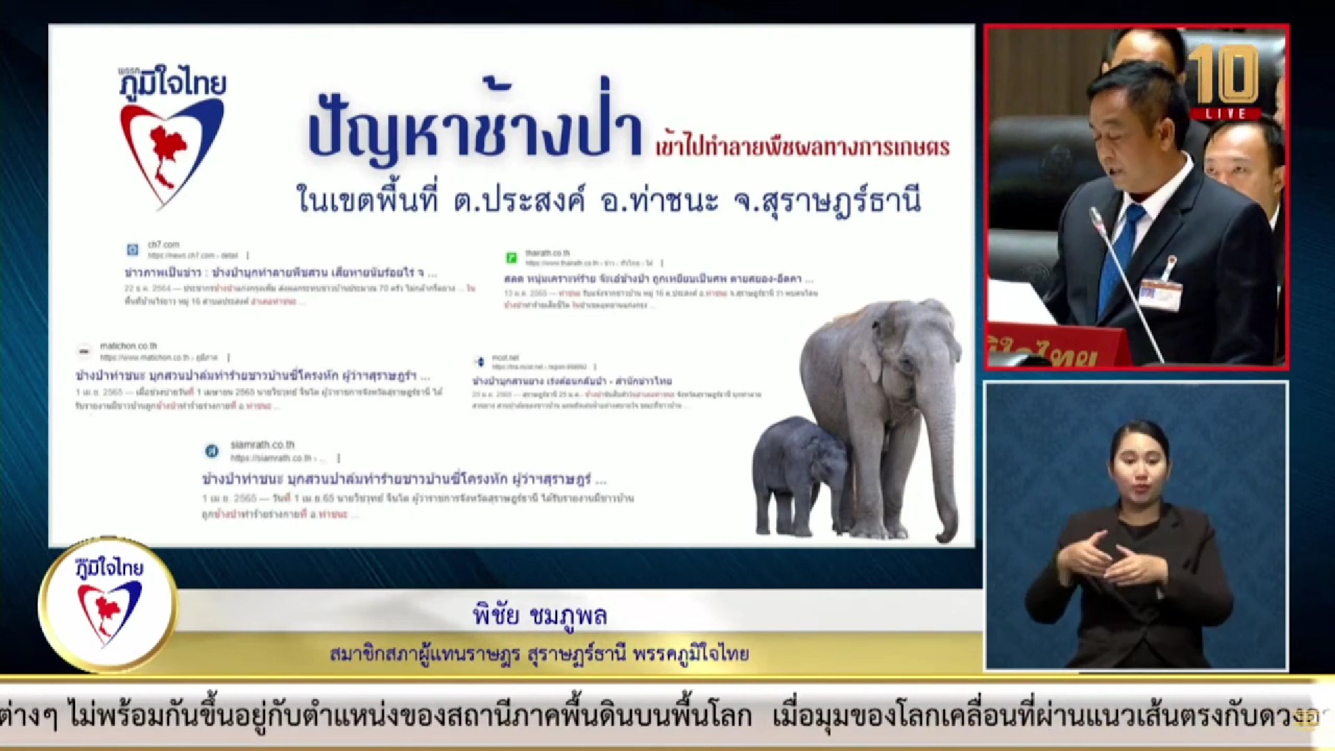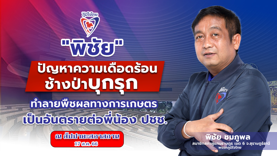 วันที่ 17 สิงหาคม 2566 นายพิชัย ชมภูพล สมาชิกสภาผู้แทนราษฎรจังหวัดสุราษฎร์ธานี เขต 6 อำเภอไชยา - ท่าฉาง - ท่าชนะ - วิภาวดี พรรคภูมิใจไทย หารือปัญหาเรื่องช้างป่าเข้าไปทำลายพืชผลทางการเกษตรของพี่น้องประชาชน ซึ่งได้รับการร้องเรียนจากนายพลศักดิ์ กรทิพย์ นายกองค์การบริหารส่วนตำบลประสงค์, นายอนุวัฒน์ อังคณานนท์ ผู้ใหญ่บ้านหมู่ที่ 15, นายบรรจบ เหล่าวงศ์ผู้ใหญ่บ้านหมู่ที่ 16, นายสมเกียรติ มากเพ็งผู้ใหญ่บ้านหมู่ที่ 17, นายทศพร อินทรคีรี ผู้ใหญ่บ้านหมู่ที่ 24 และประชาชน ในบริเวณตำบลประสงค์ อำเภอท่าชนะ จังหวัดสุราษฎร์ธานี ได้รับความเดือดร้อนจากช้างป่า ซึ่งเข้ามาครั้งละประมาณ 40-50 เชือก ในบริเวณสวนยางพารา และสวนปาล์ม บางครั้งช้างป่าได้ทำลายพืชผลทางการเกษตรของพี่น้องประชาชนจนเสียหายเป็นจำนวนหลายไร่ ทำให้พี่น้องประชาชนไม่กล้าเข้าไปทำมาหากินในพื้นที่ดังกล่าว เพราะบางครั้งช้างป่าได้เข้าไปทำร้ายพี่น้องประชาชนจนเสียชีวิต และบาดเจ็บเป็นจำนวนมาก จึงฝากผ่านไปยังผู้เกี่ยวข้องช่วยดำเนินการแก้ไขให้พี่น้องประชาชนโดยด่วน