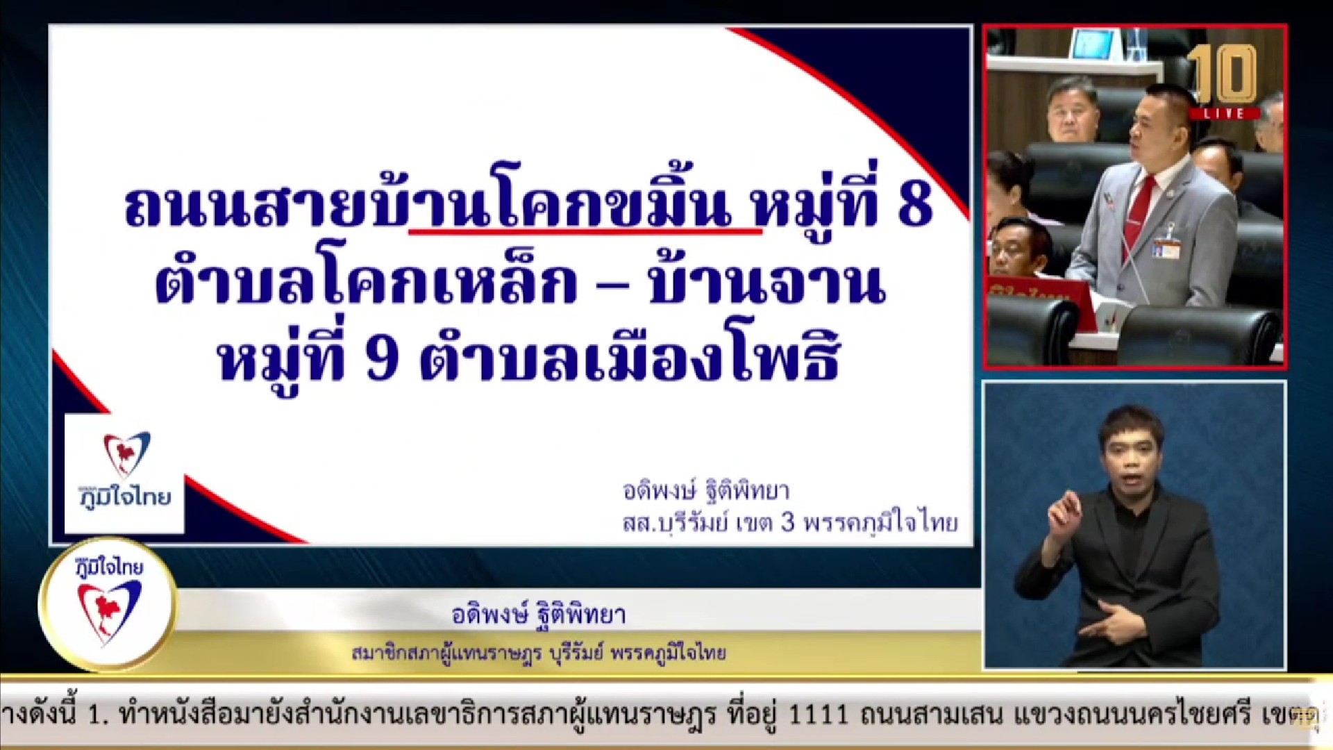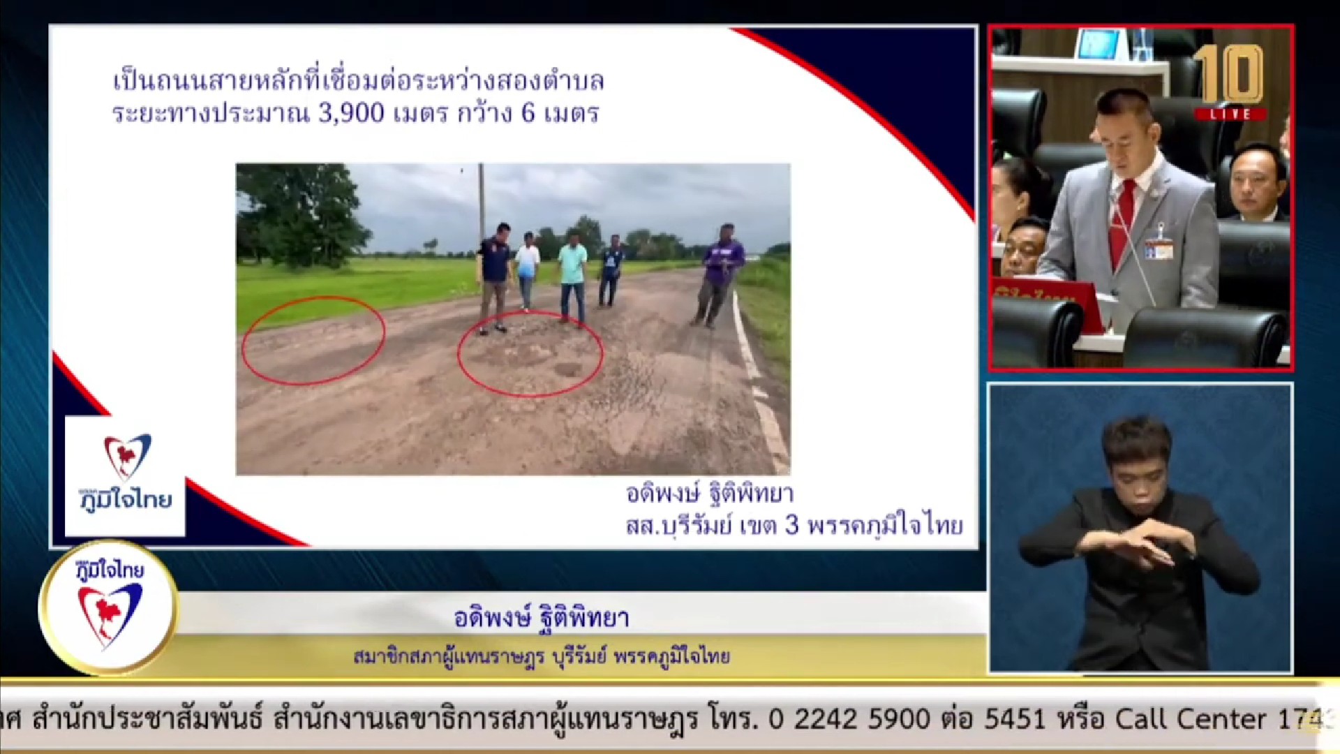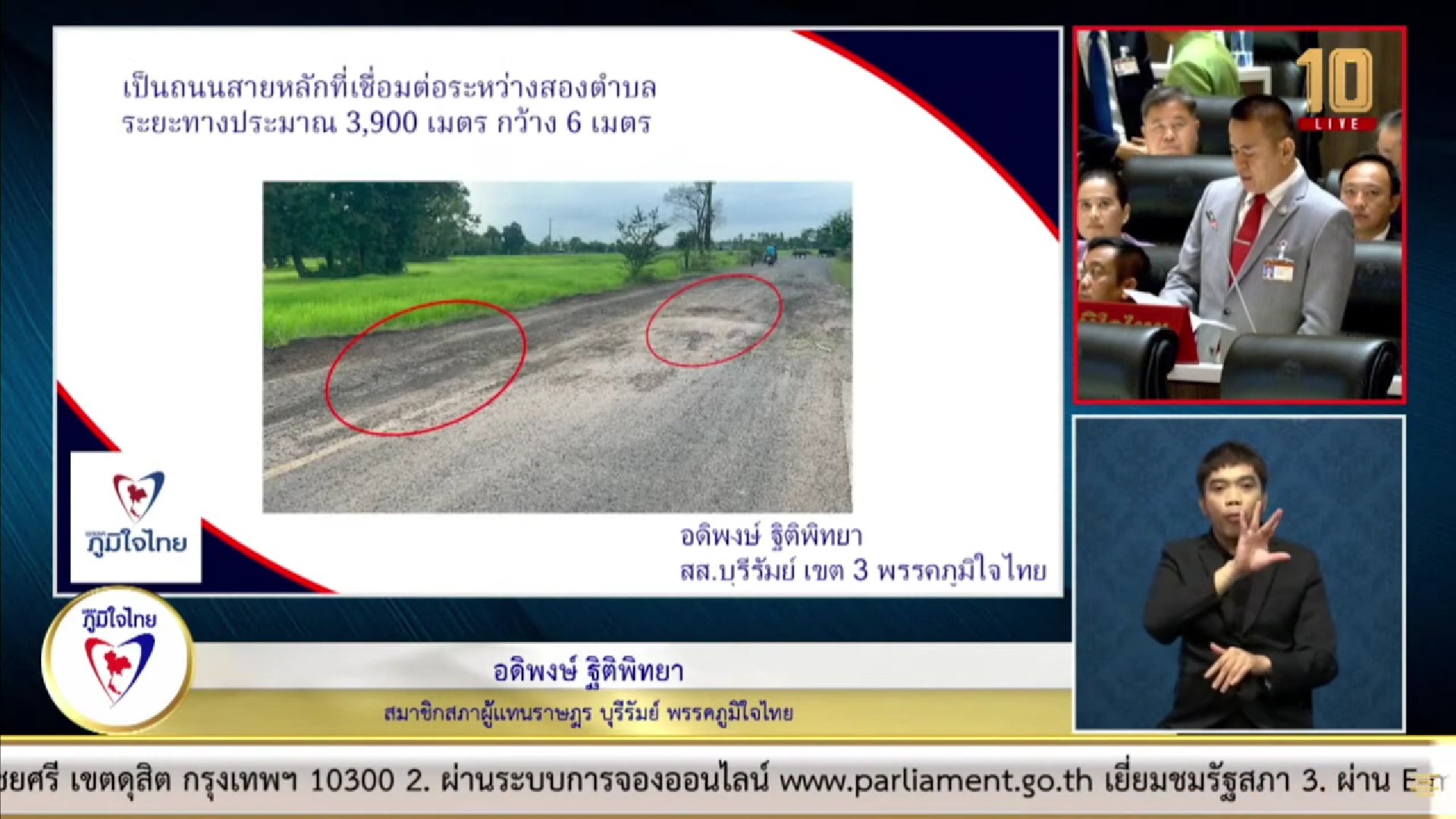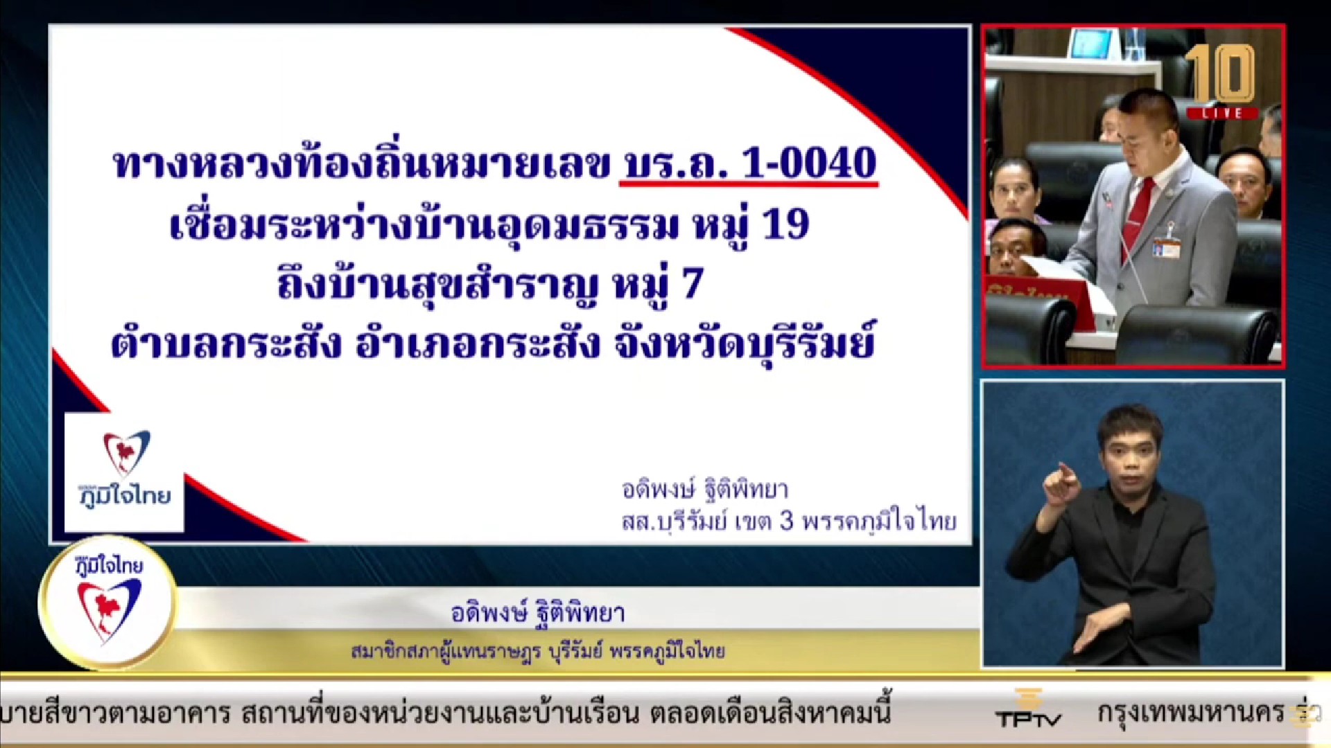 นอกจากนี้ นายอดิพงษ์ ยังได้รับการร้องเรียนจากนายกเทศมนตรีตำบุลอุดมธรรมว่า ทางหลวงท้องถิ่น บร.ถ. 1-0040 เชื่อมบ้านอุดมธรรม หมู่ 19 ถึงบ้านสุขสำราญ หมู่ 7 ตำบลกระสัง อำเภอกระสัง จังหวัดบุรีรัมย์ มีระยะทางยาว 4,500 เมตร กว้าง 6 เมตร เชื่อมระหว่างชาวบ้าน ในตำบกระสัง 5 หมู่บ้าน และหมู่บ้านในตำบลใกล้เคียง ประชาชนประสบปัญหาเกิดอุบัติเหตุ จากการใช้ถนนสัญจร เนื่องจากเป็นถนนสายหลักที่ใช้เดินทางไปเรียนหนังสือ และทำงานในตัวอำเภอ แต่กลับมีสภาพผิวถนนที่ชำรุด ทรุดโทรม เป็นหลุมเป็นบ่อขนาดใหญ่ และมีน้ำท่วมขัง ขอให้กรมการปกครองส่วนท้องถิ่น และหน่วยงานที่เกี่ยวข้อง ได้เข้ามาดูแลแก้ปัญหาให้ประชาชนที่ได้รับความเดือดร้อนที่มีจำนวนมากด้วย.