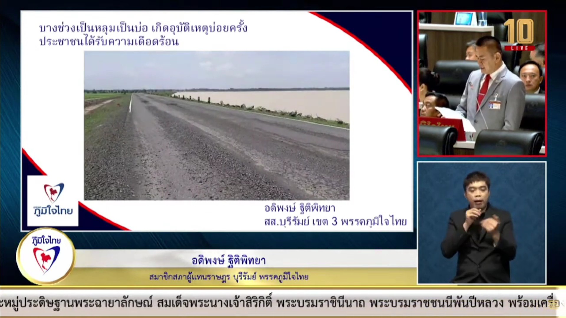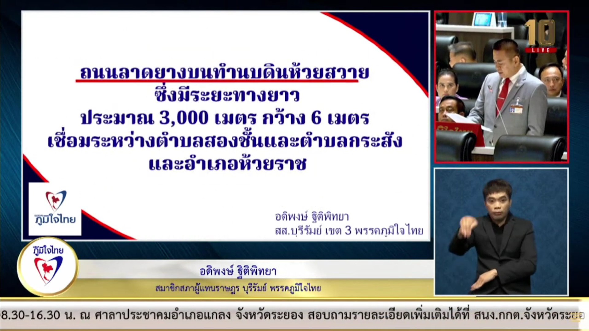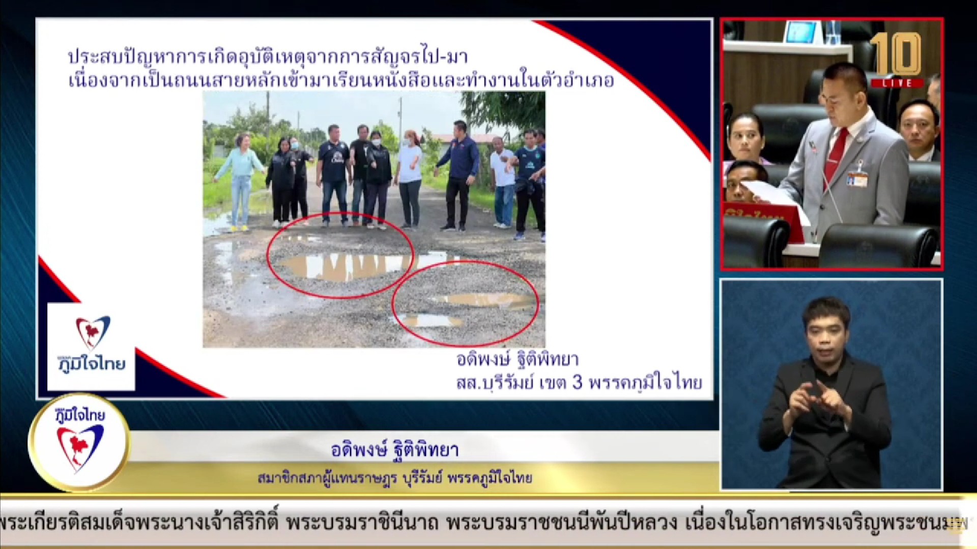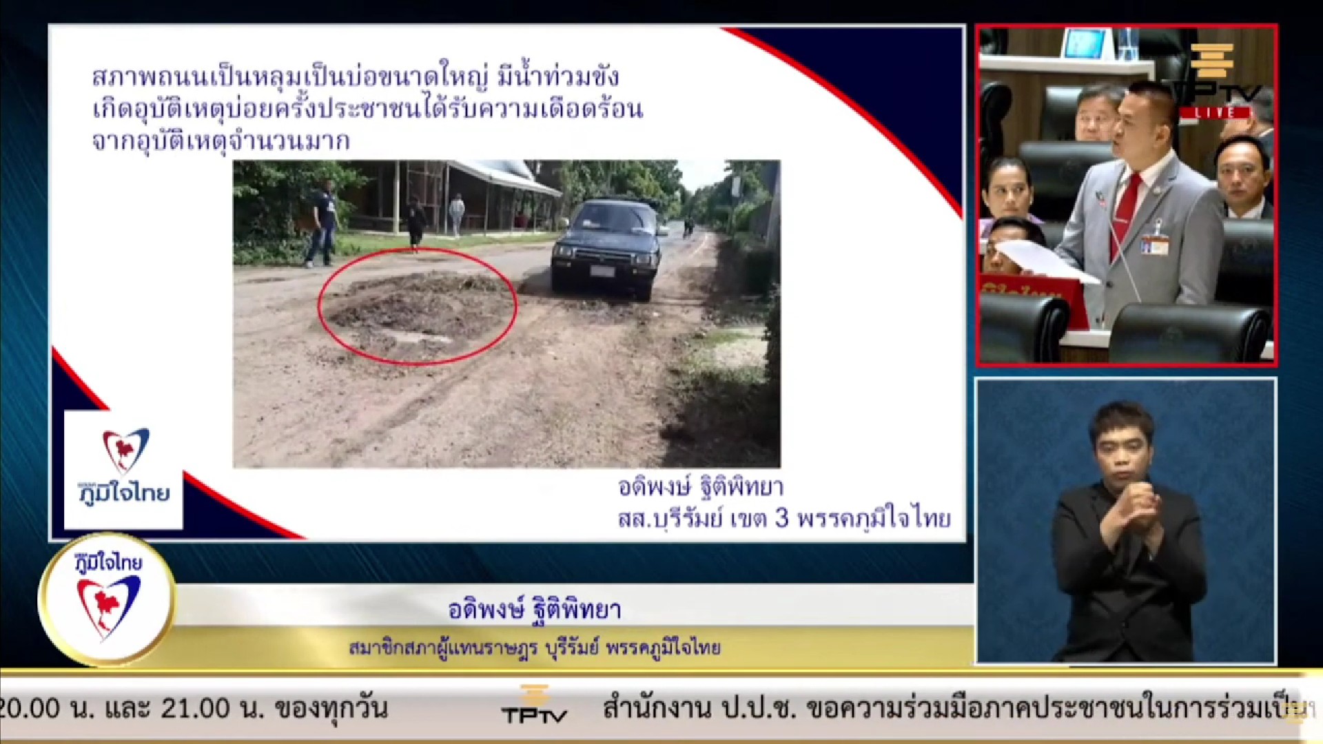 นอกจากนี้ นายอดิพงษ์ ยังได้รับการร้องเรียนจากนายกเทศมนตรีตำบุลอุดมธรรมว่า ทางหลวงท้องถิ่น บร.ถ. 1-0040 เชื่อมบ้านอุดมธรรม หมู่ 19 ถึงบ้านสุขสำราญ หมู่ 7 ตำบลกระสัง อำเภอกระสัง จังหวัดบุรีรัมย์ มีระยะทางยาว 4,500 เมตร กว้าง 6 เมตร เชื่อมระหว่างชาวบ้าน ในตำบกระสัง 5 หมู่บ้าน และหมู่บ้านในตำบลใกล้เคียง ประชาชนประสบปัญหาเกิดอุบัติเหตุ จากการใช้ถนนสัญจร เนื่องจากเป็นถนนสายหลักที่ใช้เดินทางไปเรียนหนังสือ และทำงานในตัวอำเภอ แต่กลับมีสภาพผิวถนนที่ชำรุด ทรุดโทรม เป็นหลุมเป็นบ่อขนาดใหญ่ และมีน้ำท่วมขัง ขอให้กรมการปกครองส่วนท้องถิ่น และหน่วยงานที่เกี่ยวข้อง ได้เข้ามาดูแลแก้ปัญหาให้ประชาชนที่ได้รับความเดือดร้อนที่มีจำนวนมากด้วย.