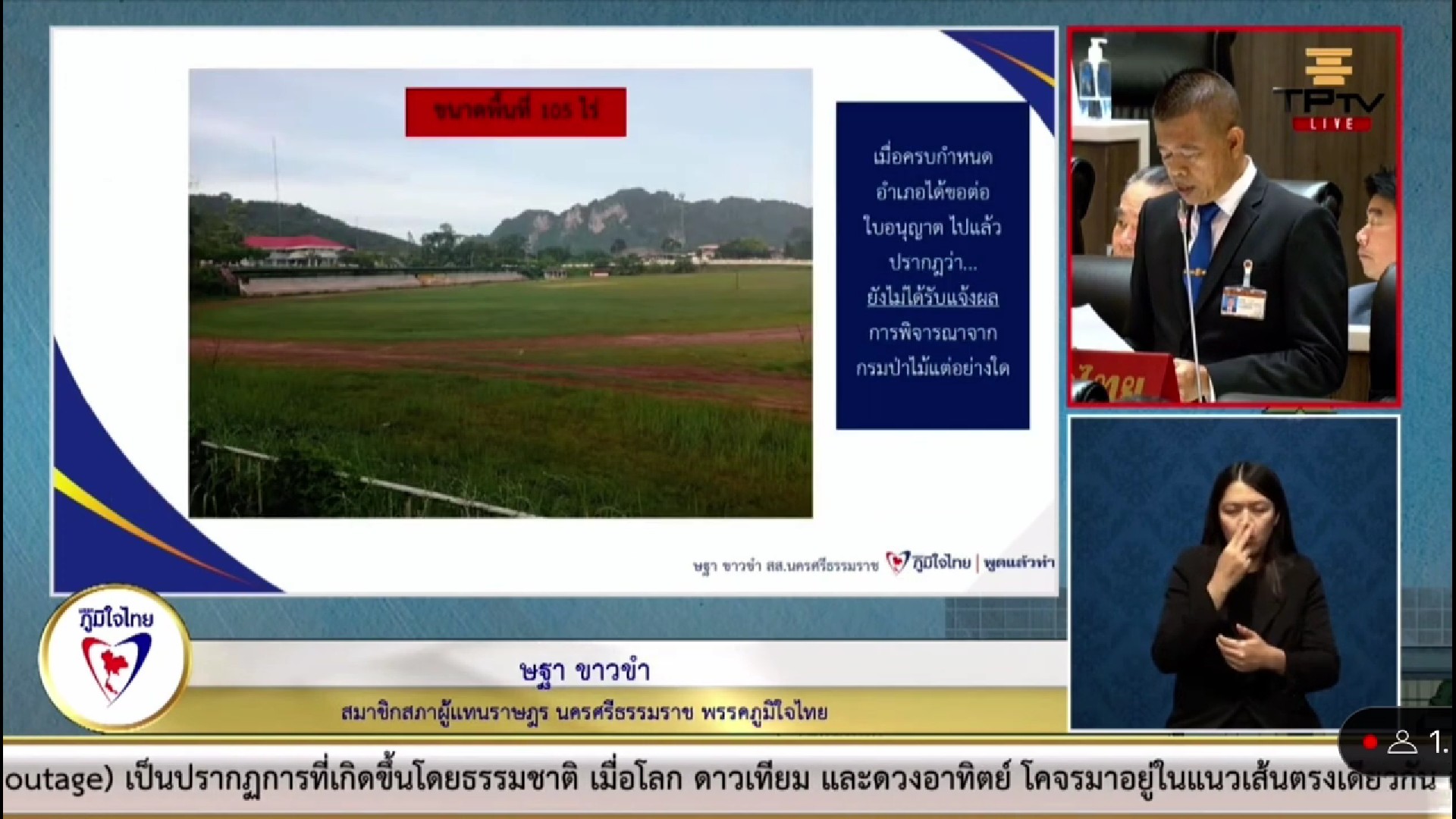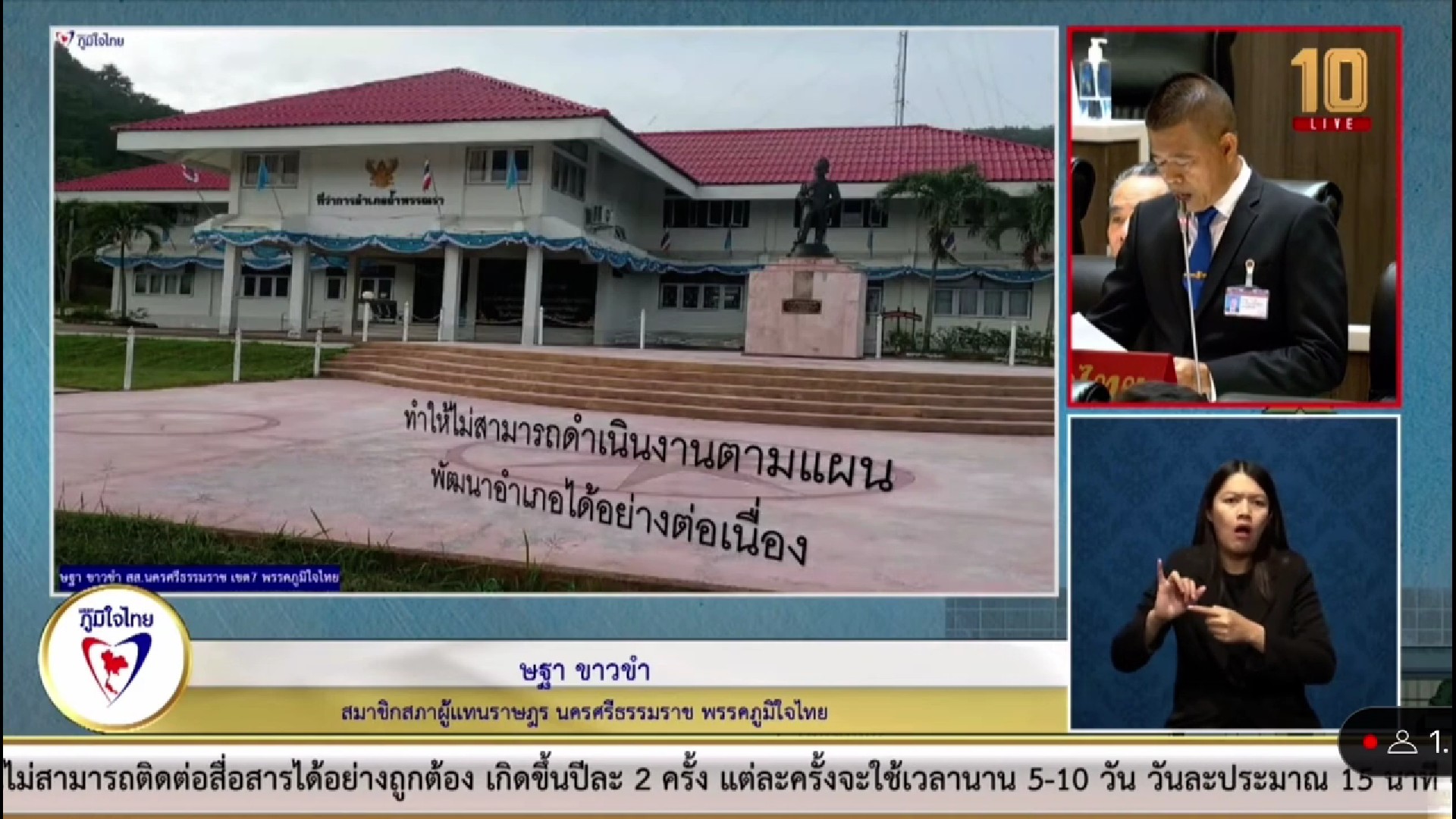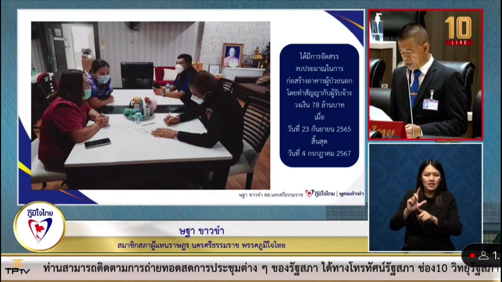 วันที่ 23 สิงหาคม 2566 นายษฐา ขาวขำ สมาชิกสภาผู้แทนราษฎรจังหวัดนครศรีธรรมราช เขตอำเภอ ถ้ำพรรณรา-ทุ่งใหญ่-บางขัน และตำบลเขาขาวอำเภอทุ่งสง พรรคภูมิใจไทย หารือถึงเรื่องความเดือดร้อนของประชาชนในการประชุมสภาฯ ครั้งที่ 9 เพื่อให้หน่วยงานที่เกี่ยวข้องพิจารณาดำเนินการ 3 เรื่อง คือ