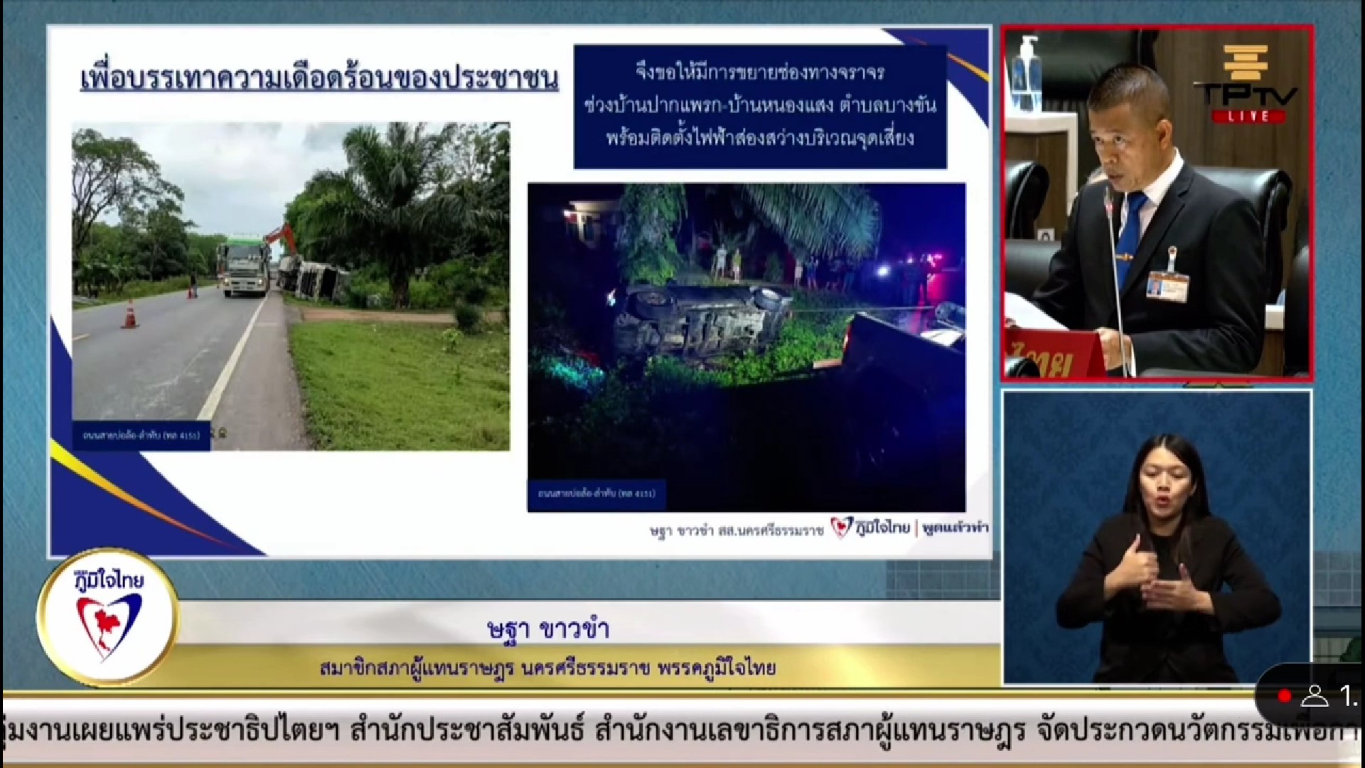 เรื่องที่ 3 การขอขยายช่องทางจราจรและติดตั้งไฟสว่าง ถนนสายบ่อล้อ-ลำทับ (ทล 4151) เชื่อมต่อระหว่างจังหวัดนครศรีธรรมราชกับจังหวัดกระบี่ ซึ่งเป็นถนนสายหลักในพื้นที่ของอำเภอบางขัน โดยมีประชาชนใช้เส้นทางนี้เป็นจำนวนมาก แต่เนื่องจากถนนมีสภาพชำรุด และคับแคบ ไม่มีไฟฟ้าส่องสว่างจึงทำให้เกิดอุบัติเหตุขึ้นบ่อยครั้ง สร้างความเสียหายแก่เสียชีวิต และทรัพย์สินเป็นจำนวนมาก เพื่อบรรเทาความเดือดร้อนของพี่น้อง ประชาชน จึงขอให้มีการขยายช่องทางจราจรจากบ้านปากแพรก-บ้านหนองแสง ต.บางขัน พร้อมติดตั้งไฟส่องสว่างบริเวณจุดเสี่ยงด้วย.