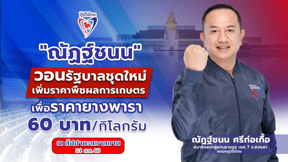 24 สิงหาคม 2566 นายณัฏฐ์ชนน ศรีก่อเกื้อ สมาชิมาขิกสภาผูแทนราษฎร จังหวัดสงขลา เขต7 พรรคภูมิใจไทย ได้กล่าวถึงปัญหาราคายางพาราที่ตกต่ำมาอย่างต่อเนื่องทำให้ชาวสวนยางได้รับความเดือดร้อนเป็นอย่างมาก
