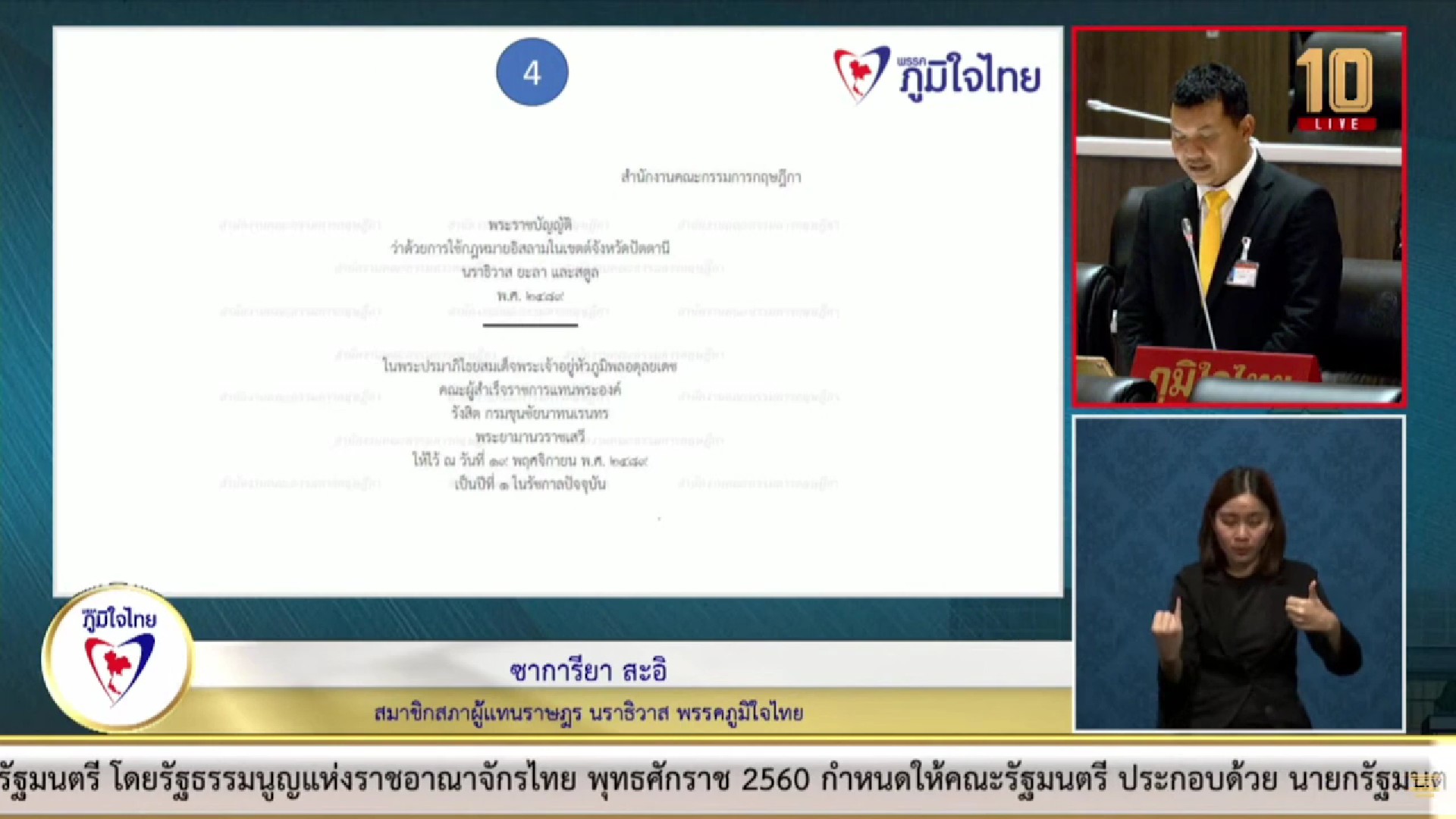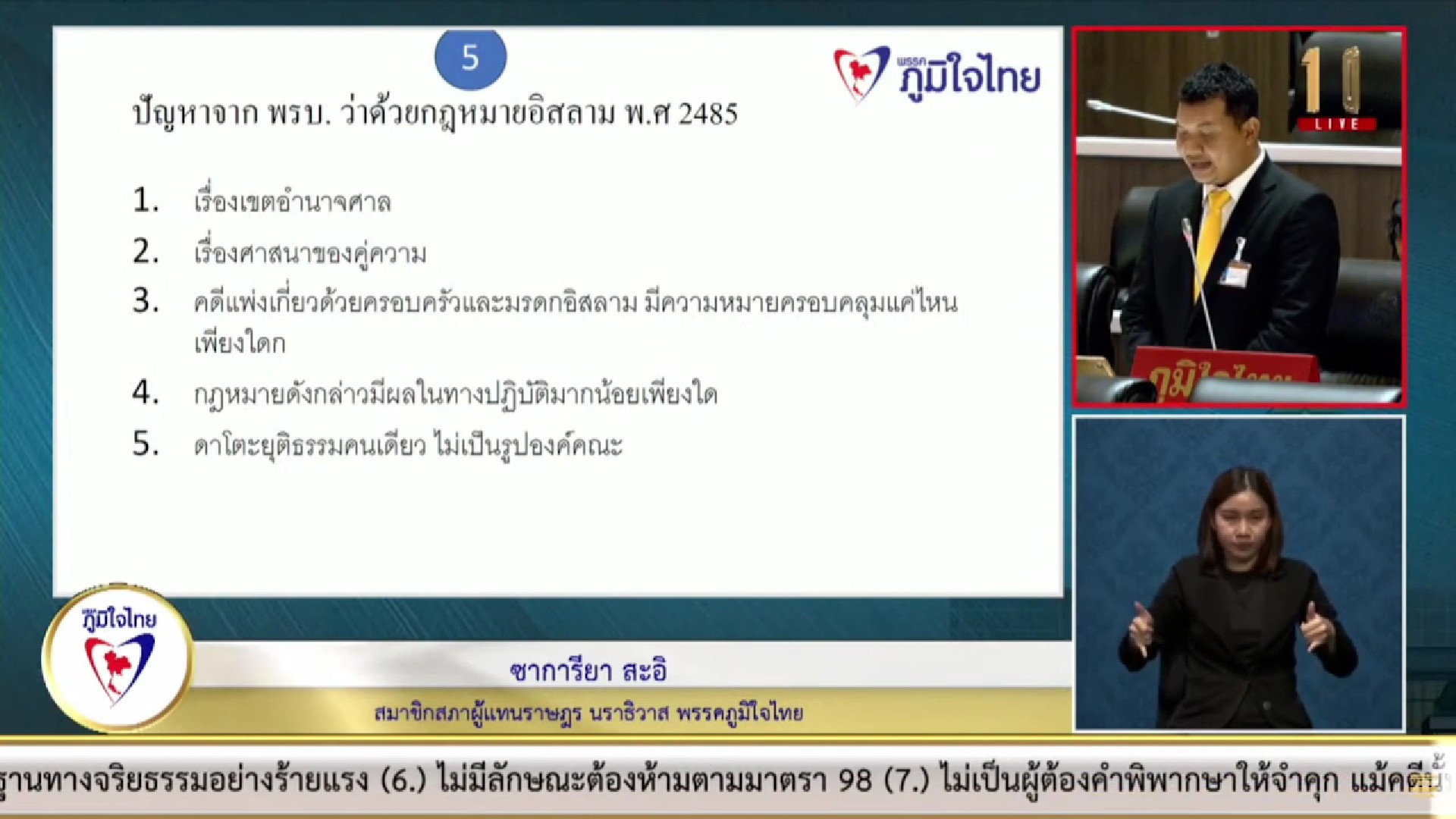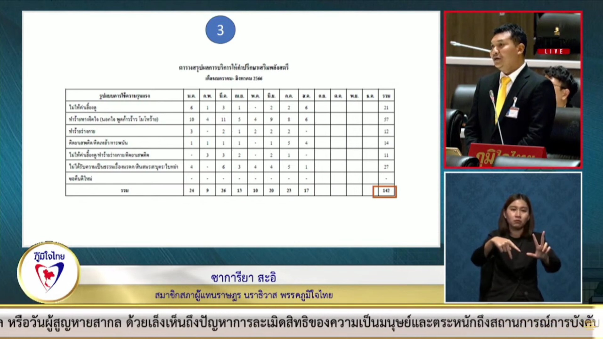 นายซาการียา ได้อภิปรายว่า จากข้อมูลที่ทางพม.ได้นำเสนอ แสดงให้เห็นว่าสถิติความรุนแรงในครอบครัวในจังหวัดนราธิวาสมีแนวโน้มเพิ่มขึ้นอย่างต่อเนื่อง โดยในปี 2565 มีจำนวนผู้ตกเป็นเหยื่อทั้งสิ้น 142 คน สาเหตุหลักของความรุนแรงในครอบครัวนั้นมาจากปัญหาหลายอย่างในชุมชน ไม่ว่าจะเป็นปัญหาการพนัน ยาเสพติด และความเหลื่อมล้ำทางเศรษฐกิจ ทั้งนี้ เข้าใจดีว่าความรุนแรงในครอบครัวถือเป็นปัญหาที่ส่งผลกระทบต่อสังคมในวงกว้าง ทั้งในด้านเศรษฐกิจ สังคม และจิตใจ จึงขอเรียกร้องให้หน่วยงานที่เกี่ยวข้องเร่งดำเนินการแก้ไขปัญหานี้อย่างจริงจัง โดยเน้นการแก้ไขที่ต้นเหตุ เช่น การป้องกันไม่ให้เกิดการพนัน และยาเสพติดในชุมชน การส่งเสริมให้คนในชุมชนมีรายได้เพียงพอเลี้ยงชีพ และการให้ความรู้และความเข้าใจเกี่ยวกับความรุนแรงในครอบครัวแก่ประชาชน