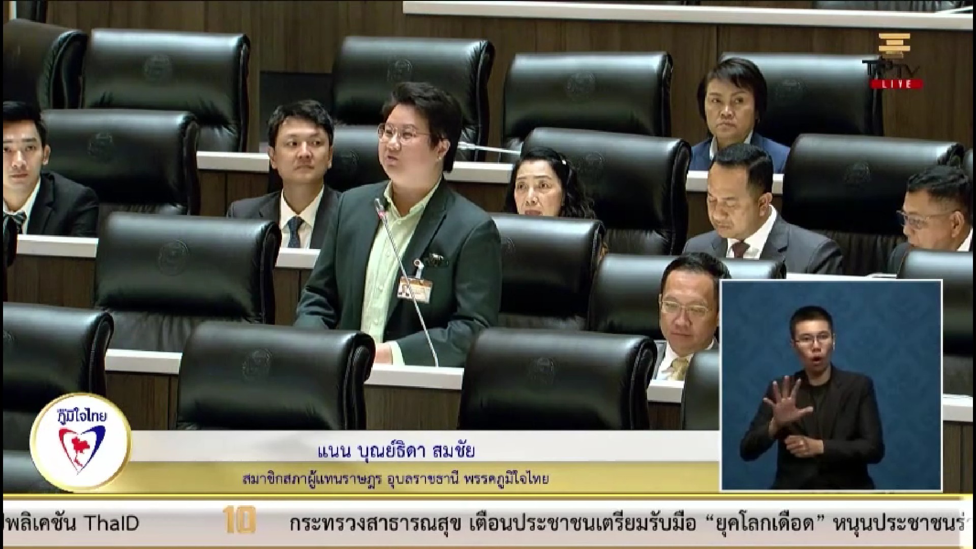 30 สิงหาคม 2566 นางสาวแนน บุณย์ธิดา สมชัย สมาชิกสภาผู้แทนราษฎร จังหวัดอุบลราชธานี อภิปรายรับทราบข้อมูลสถานการณ์ด้านความรุนแรงในครอบครัวของกระทรวงการพัฒนาสังคมและความมั่นคงของมนุษย์ ประเด็นสำคัญที่พบมีดังนี้