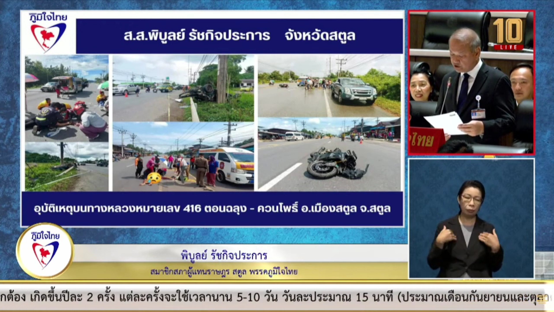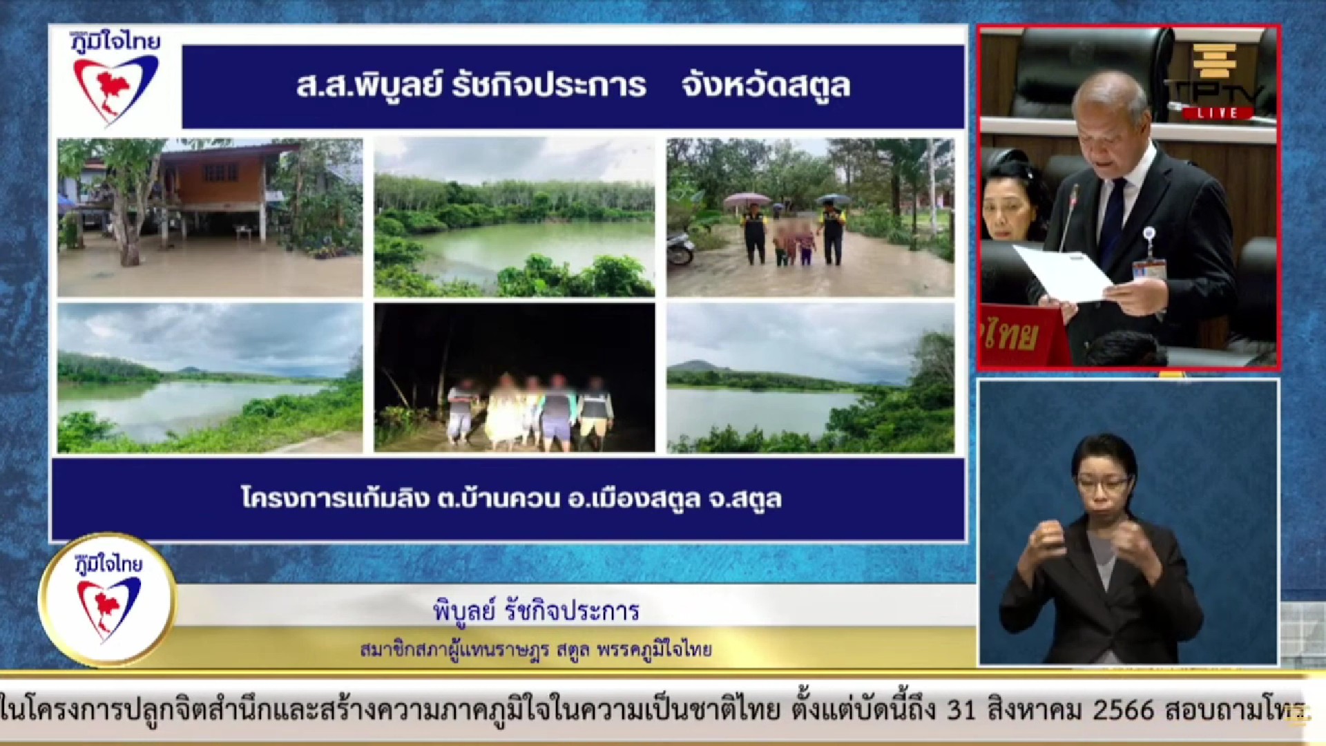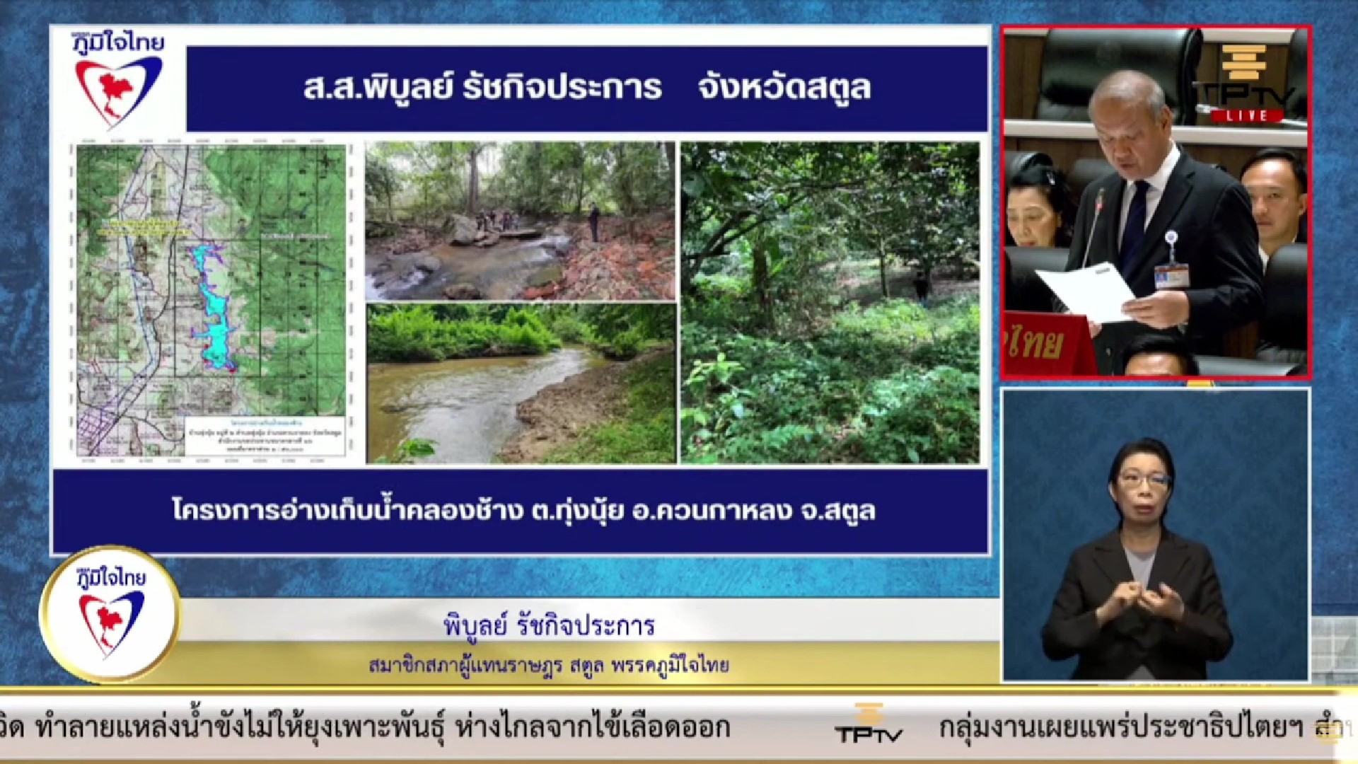 กรณีประชาชน ต.วังประจัน ต.ควนโดน ต.ควนสตอ อ.ควนโดน ต.ปูยู ต.เจ๊บิลัง และต.คนเข้าเมือง จังหวัดสตูล เดือดร้อนเรื่องที่ดินทำกินและที่อาศัยอยู่ เนื่องจากประกาศพื้นที่ป่าสงวนแห่งชาติ ทั้ง 6 ตำบล มีที่ตั้งอยู่ ในเขตป่าถาวร และป่าชายเลน ประเด็นนี้เช่นกันก็ได้ถูกหารือไปแล้วในปี 2565 แต่ตอนนี้ การแก้ไขเรื่องที่ดินทำกิน และที่อยู่อาศัย ไปถึงขั้นตอนไหน เพราะชาวบ้านก็สอบถามมา จึงอยากให้หน่วยงานที่เกี่ยวข้องรีบแก้ปัญหาให้กับพี่น้องประชาชนด้วย นายพิบูลย์ กล่าว.