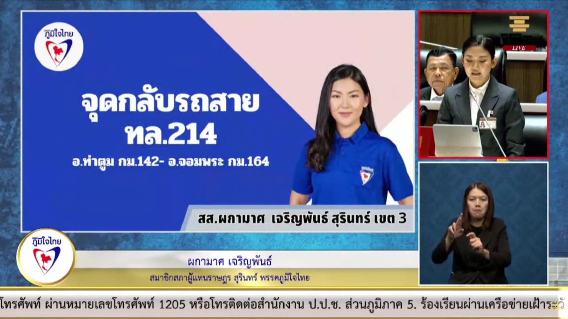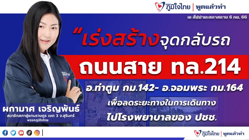 โดยนางสาวผกามาศ กล่าวว่า บนถนนหมายเลข 214 เริ่มต้นที่อำเภอท่าตูม ถึงอำเภอจอมพระ ระยะทาง 21 กิโลเมตรนั้น มีจุดกลับรถห่างกันค่อนข้างไกล ทำให้ประชาชนเสียเวลาและไม่สามารถเดินทางได้ทันเหตุการณ์ ควรพิจารณาเพิ่มจุดกลับรถให้เพียงพอ และเหมาะสมกับสภาพการใช้งานจริง โดยคำนึงถึงความปลอดภัยของผู้ใช้รถใช้ถนนเป็นหลัก
