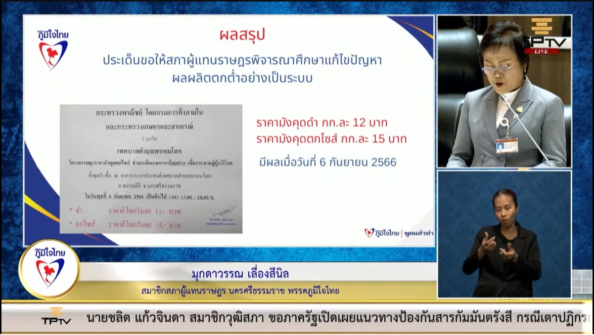 วันที่ 7 กันยายน 2566 นางมุกดาวรรณ เลื่องสีนิล สมาชิกสภาผู้แทนราษฎร จังหวัดนครศรีธรรมราช เขต 8 พรรคภูมิใจไทย ได้สรุปความก้าวหน้าในการแก้ไขปัญหาราคามังคุดตกต่ำ ในการประชุมสภาผู้แทนราษฎร ครั้งที่ 14