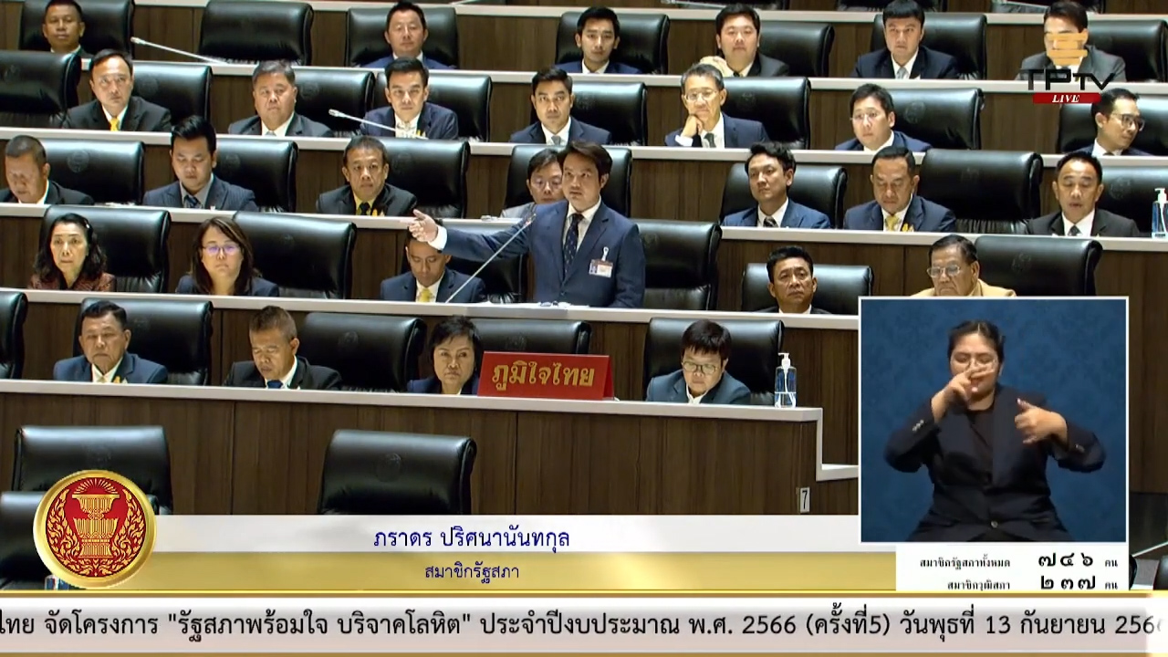 นายภราดร ปริศนานันทกุล สมาชิกสภาผู้แทนราษฎร จังหวัดอ่างทอง เขต 1 พรรคภูมิใจไทย ขอบคุณนายกรัฐมนตรี และคณะรัฐมนตรีที่แถลงนโยบายต่อรัฐสภา และ อภิปรายนโยบายตามมาตรา162 ของรัฐธรรมนูญแห่งราชอาณาจักรไทย