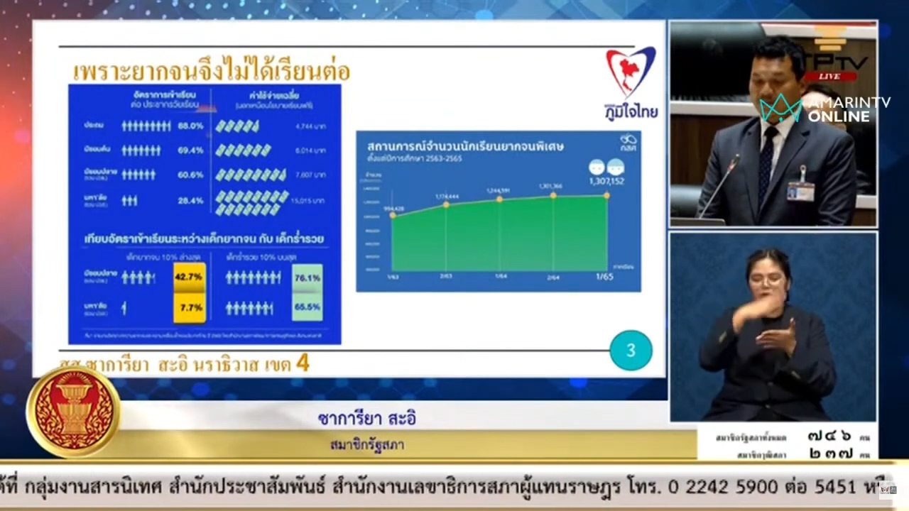 ส่วนเรื่องปัญหาความยากจน และเหลื่อมล้ำทางการศึกษา โดยอ้างอิงสถิติจากสภาพัฒน์ประจำปี 2563 พบว่า มีนักศึกษาเข้าเรียนในระดับอุดมศึกษาเพียง 28.4% และมีนักเรียนยากจนเพียง 7.7% เท่านั้นที่สามารถเข้าเรียนในระดับอุดมศึกษาได้ ส่วนจำนวนนักเรียนยากจนพิเศษมีจำนวนเพิ่มขึ้นอย่างก้าวกระโดดจาก 990,000 คนในปี 2563 เป็น 1,300,000 คนในปี 2565