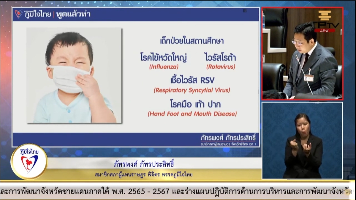 ต่อมา ในปัญหาเด็กป่วยในสถานศึกษาซึ่งพบเป็นจำนวนมาก ส่งผลให้โรงเรียนต้องปิดการเรียนการสอนและโรงพยาบาลเตียงเต็ม สาเหตุของปัญหานี้อาจเกิดจากปัจจัยหลายประการ เช่น โรคติดต่อที่ระบาดในเด็ก เช่น ไข้หวัดใหญ่ RSV โรคมือเท้าปาก และไวรัสโรต้า และปัญหาด้านสุขอนามัยในสถานศึกษา นายภัทรพงศ์ ได้เสนอแนวทางแก้ไขดังนี้ กระทรวงสาธารณสุขและกระทรวงศึกษาธิการควรออกมาตรการป้องกันโรคติดต่อในสถานศึกษา เช่น การคัดกรองเด็กก่อนเข้าเรียน ส่วนผู้ปกครองควรดูแลสุขอนามัยของเด็กอย่างใกล้ชิด ในเรื่องความสะอาด รวมทั้งเรื่องอาหาร สถานศึกษาควรปรับปรุงสุขอนามัยในโรงเรียนให้สะอาดอย่างสม่ำเสมอ