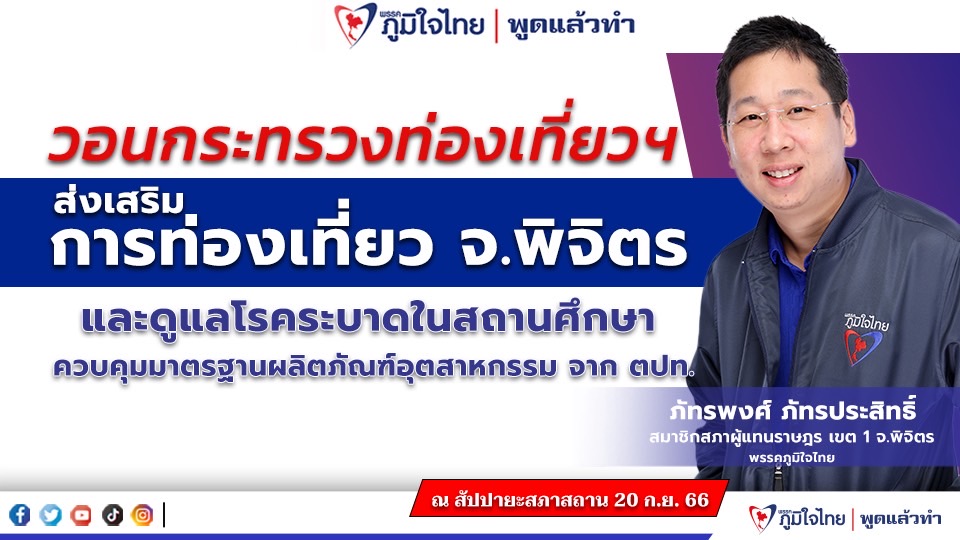 สส.จ.พิจิตร "ภัทรพงศ์ ภัทรประสิทธิ์" วอนกระทรวงท่องเที่ยวส่งเสริมการท่องเที่ยวจังหวัดพิจิตรและดูแลโรคระบาดในสถานศึกษาควบคุมมาตรฐานผลิตภัณฑ์อุตสาหกรรมจากต่างประเทศ