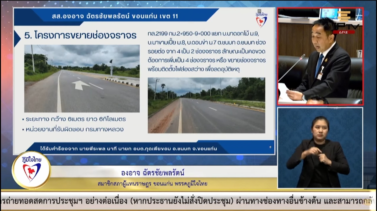 โครงการที่ 5 โครงการขยายช่องจราจรทางหลวงหมายเลข 2199 กรมทางหลวง จากช่วงบริเวณบ้านนาดอกไม้ บ้านนาชามเปี้ย บ้านดอนข่า ต.ชนบท อ.ชนบท จาก 2 ช่องจราจร เป็น 4 ช่องจราจร หรือขยายช่องจราจรให้กว้างขึ้น พร้อมติดตั้งไฟฟ้าส่องสว่าง เพื่อลดอุบัติเหตุ ปัจจุบันเป็นลักษณะคอขวดเป็นอันตราย